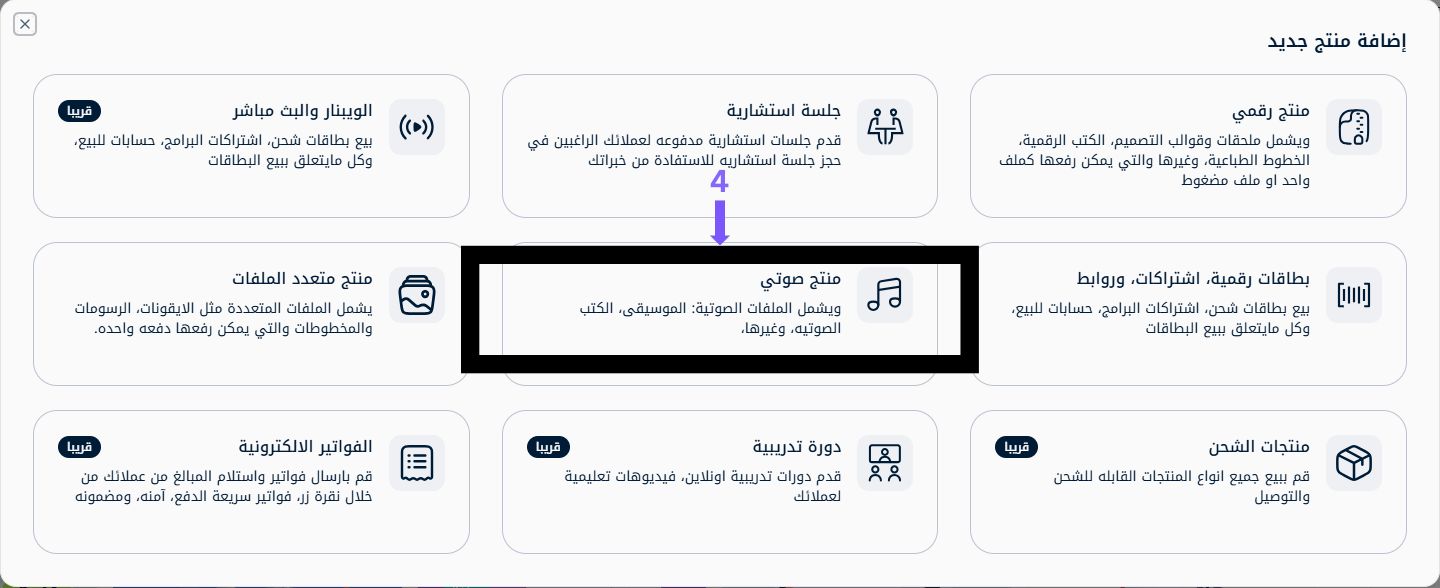 4- اختيار نوع المنتج :- من قائمة أنواع المنتجات، اختر منتج صوتي لتظهر لك الإعدادات الخاصة به.