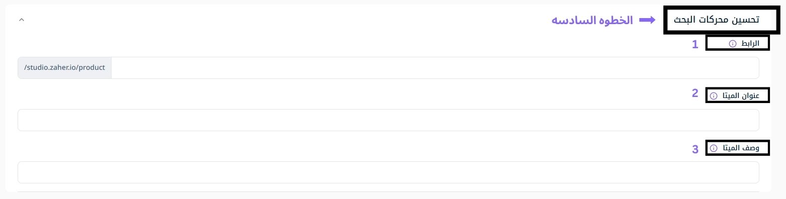 6- تحسين محركات البحث (SEO) :- تساعدك هذه الميزة من زاهر في زيادة فرصة ظهور منتجك في نتائج البحث، فيكون عليك إضافة: