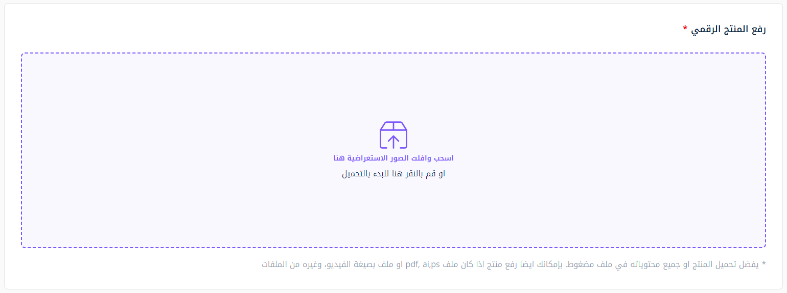 في قسم رفع المنتج الرقمي، اسحب ملفك الصوتي وضعه في المساحة المخصصة أو اضغط لاختيار الملف من جهازك، ثم حدد صيغة الملف، مع العلم أن هذه النسخة لا تحتوي على العلامة المائية.