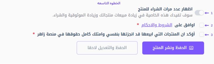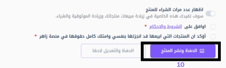 9- نشر المنتج :- بعد مراجعة كل التفاصيل وبيانات المنتج، اضغط على زر "الحفظ والنشر".