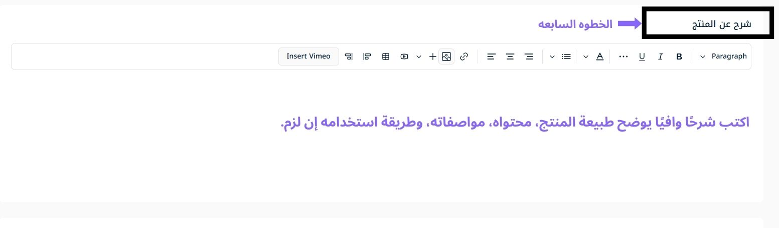 7- شرح عن المنتج :- اكتب شرحًا وافيًا يوضح طبيعة المنتج، محتواه، مواصفاته، وطريقة استخدامه إن لزم.
