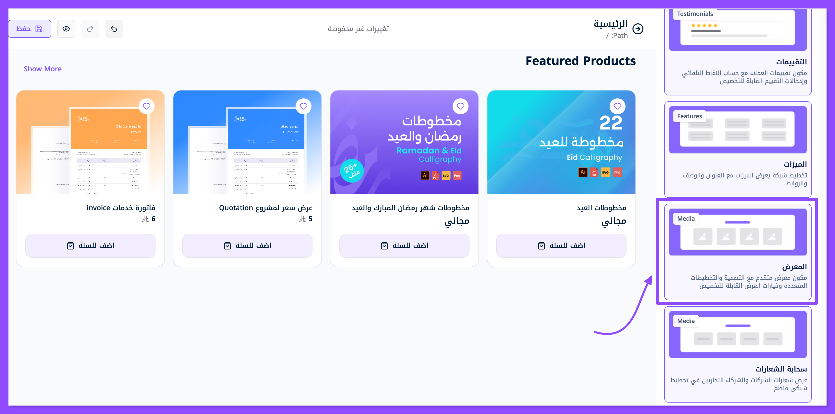 اتبع الطريقة التالية لتخصيص وتصميم قسم معرض الأعمال في موقعك: