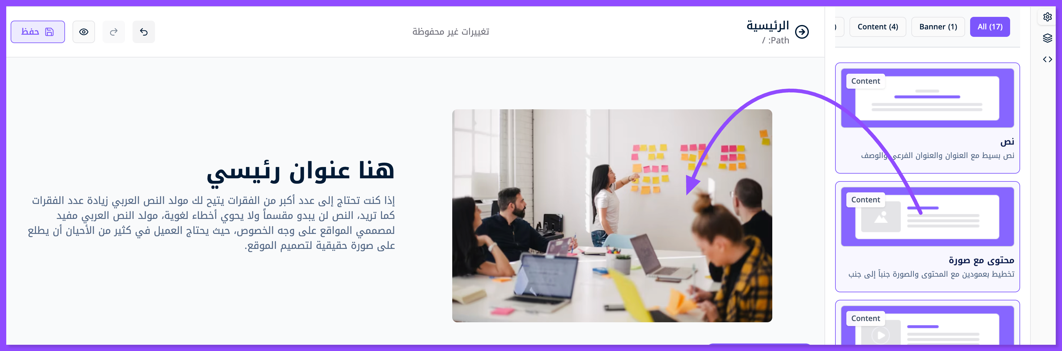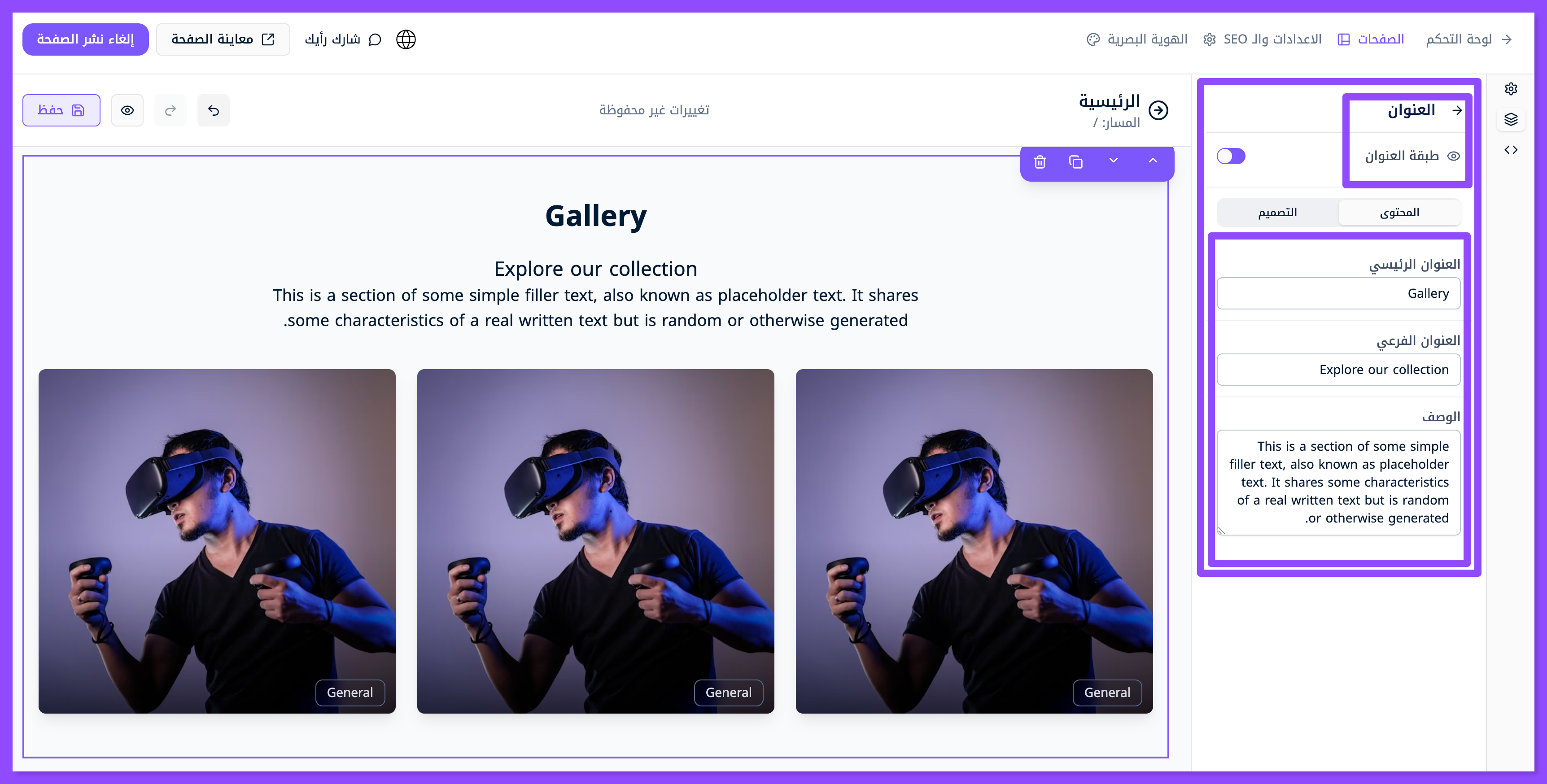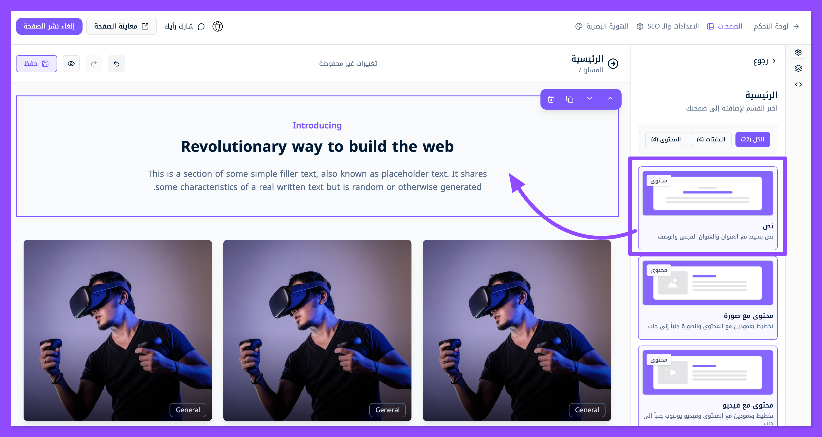 لتخصيص محتوى معين لكل صورة في معرض أعمالك، ابحث عن قسم محتوى مع صورة، واسحبه وافلته في الموضع المناسب من صفحتك.