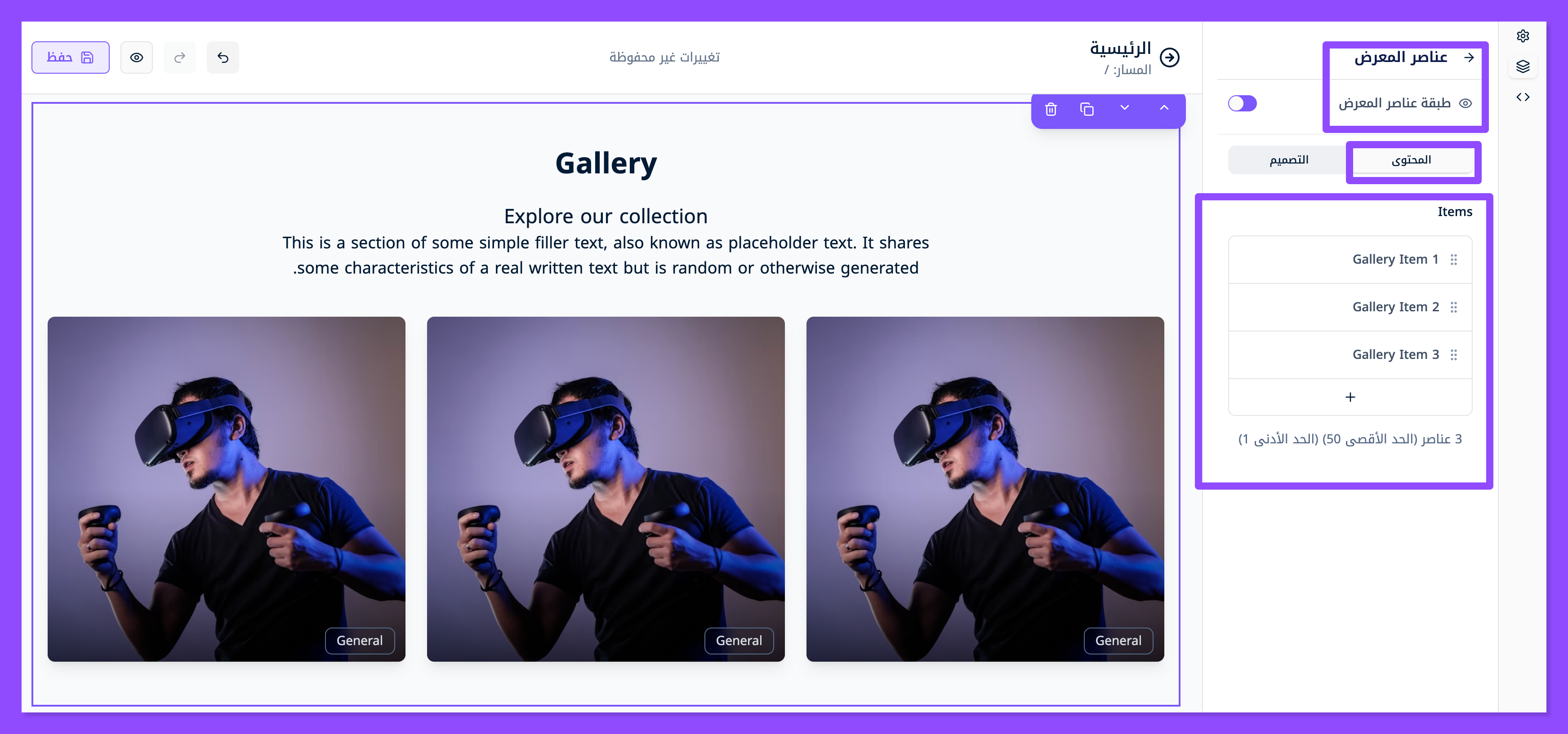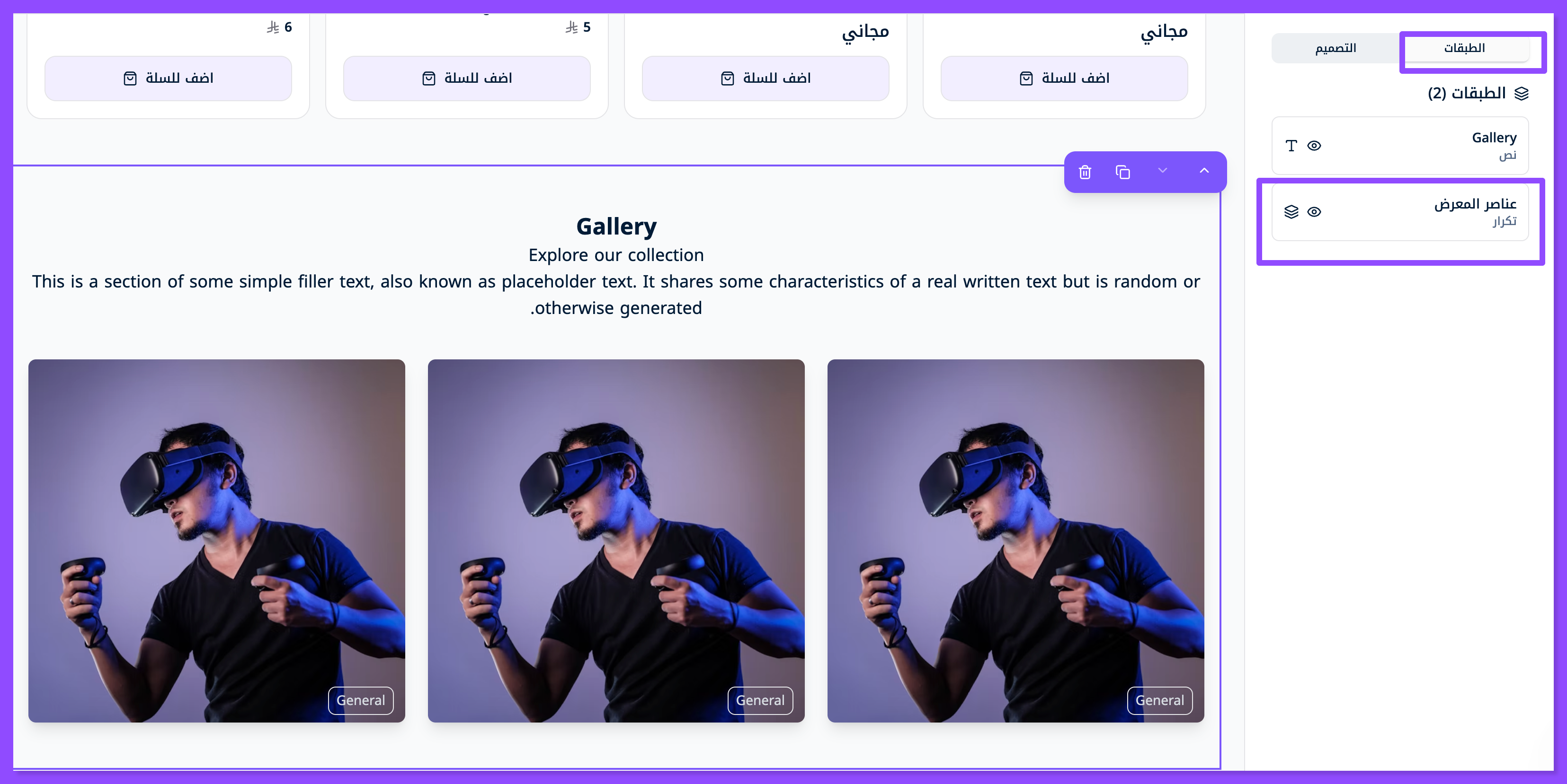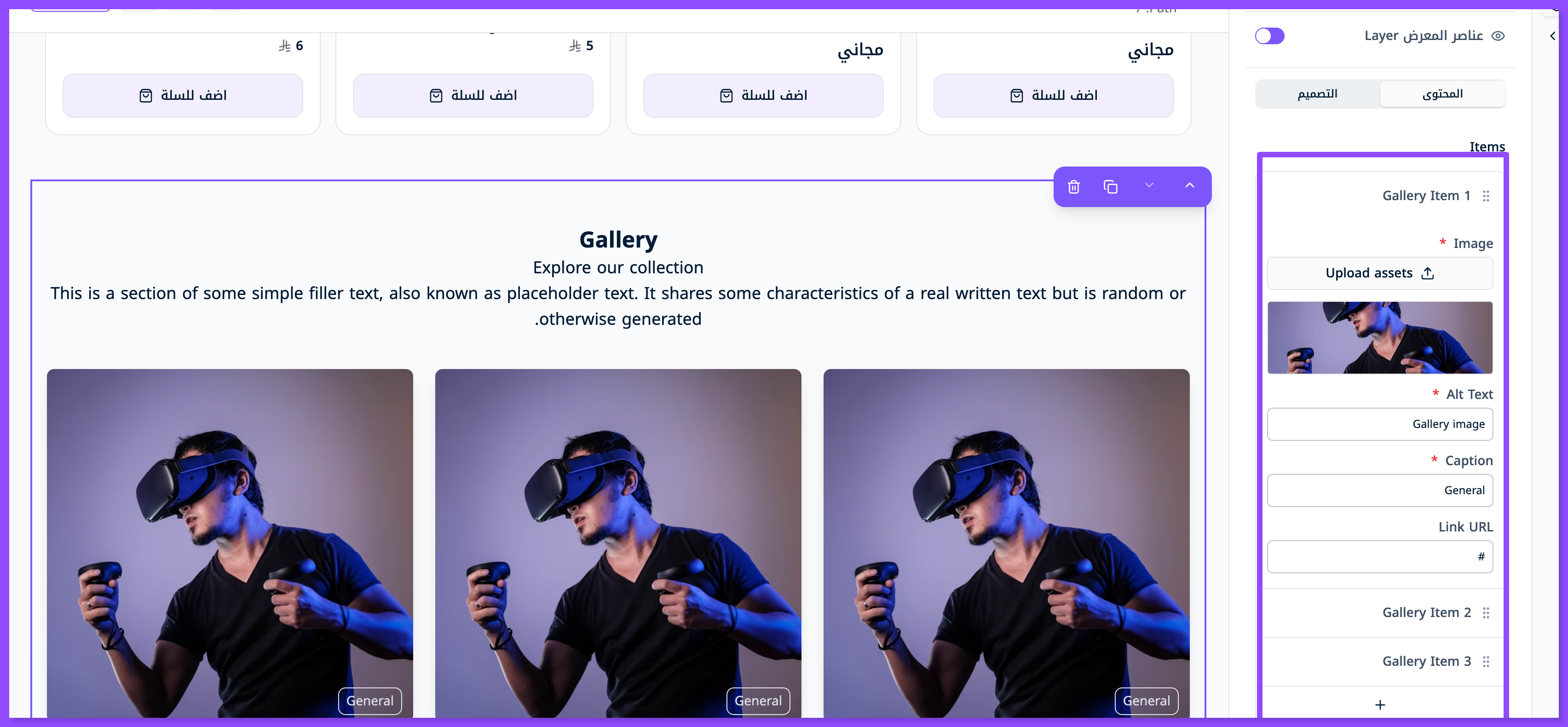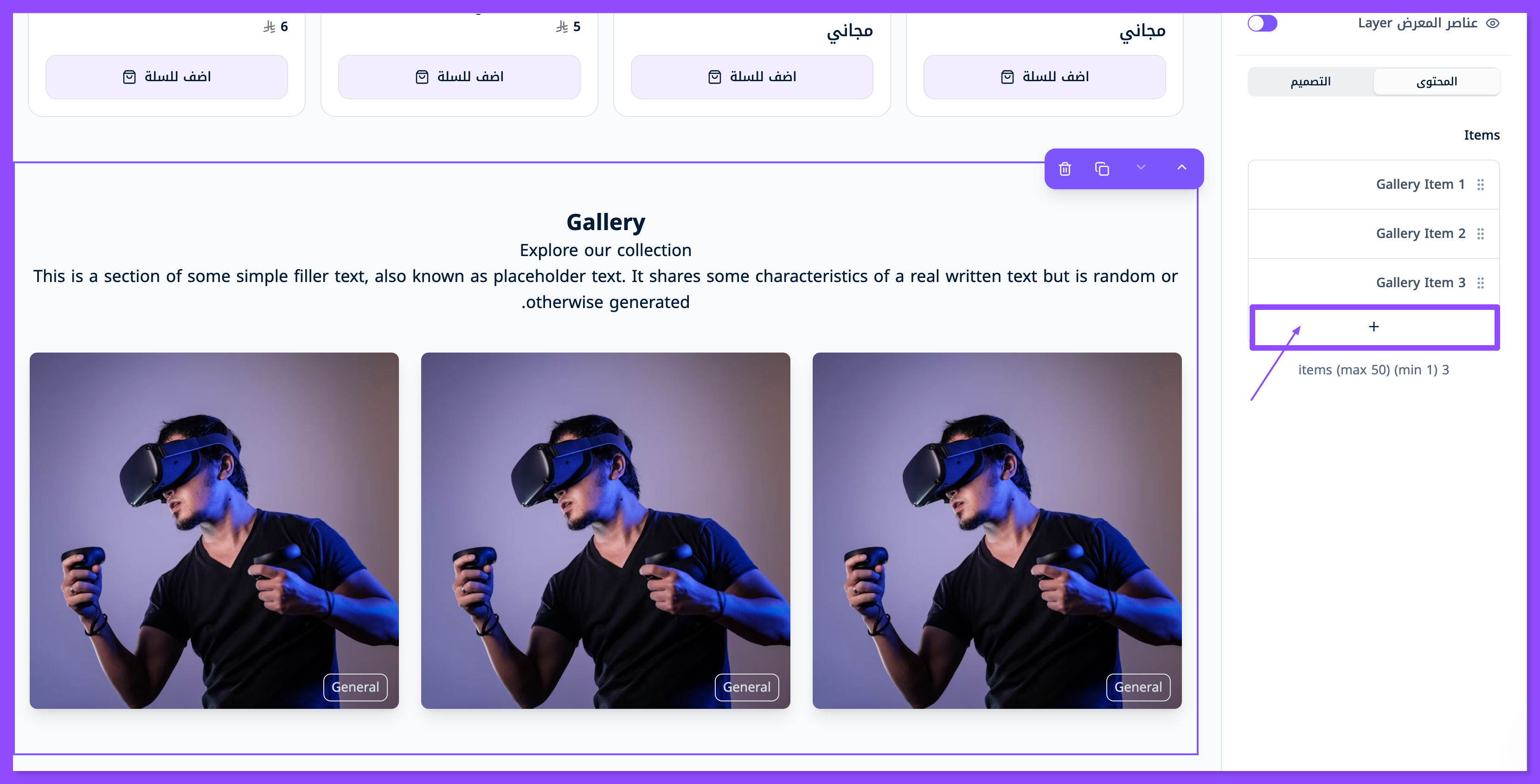 تستطيع إضافة عدد غير محدود من العناصر في المعرض (المزيد من الصور) عبر الضغط على إشارة (+) الظاهرة أصل العناصر.