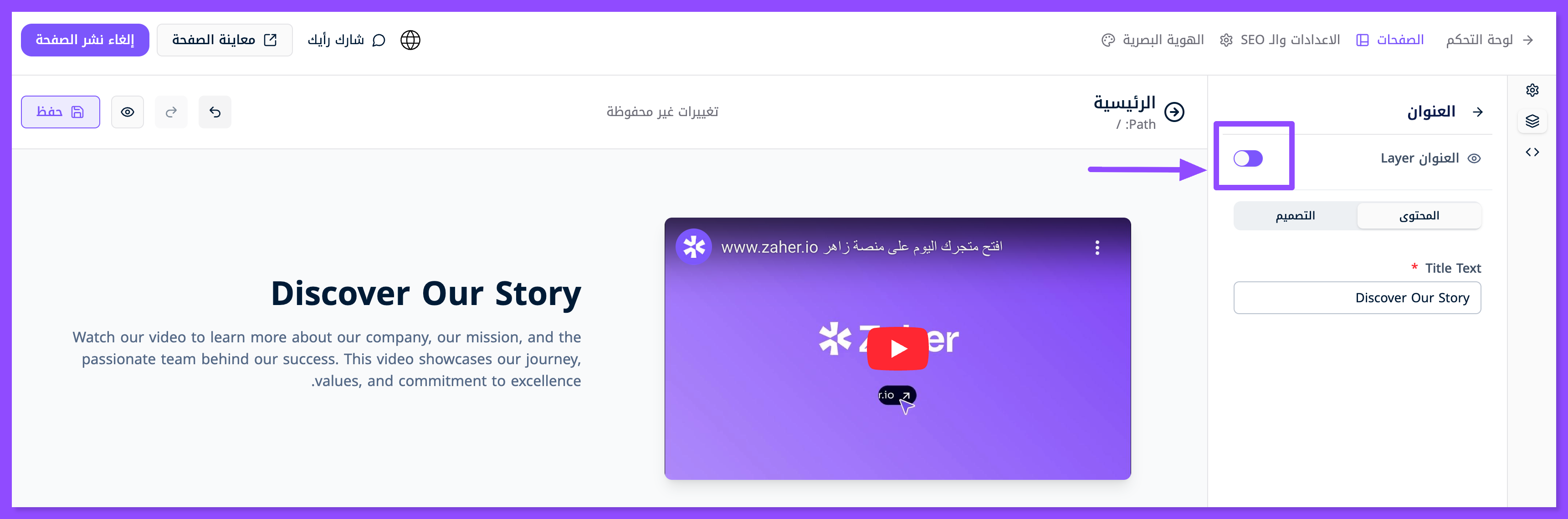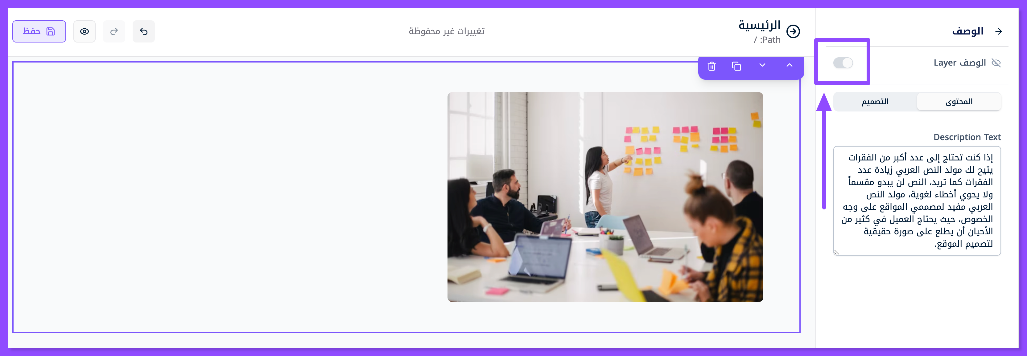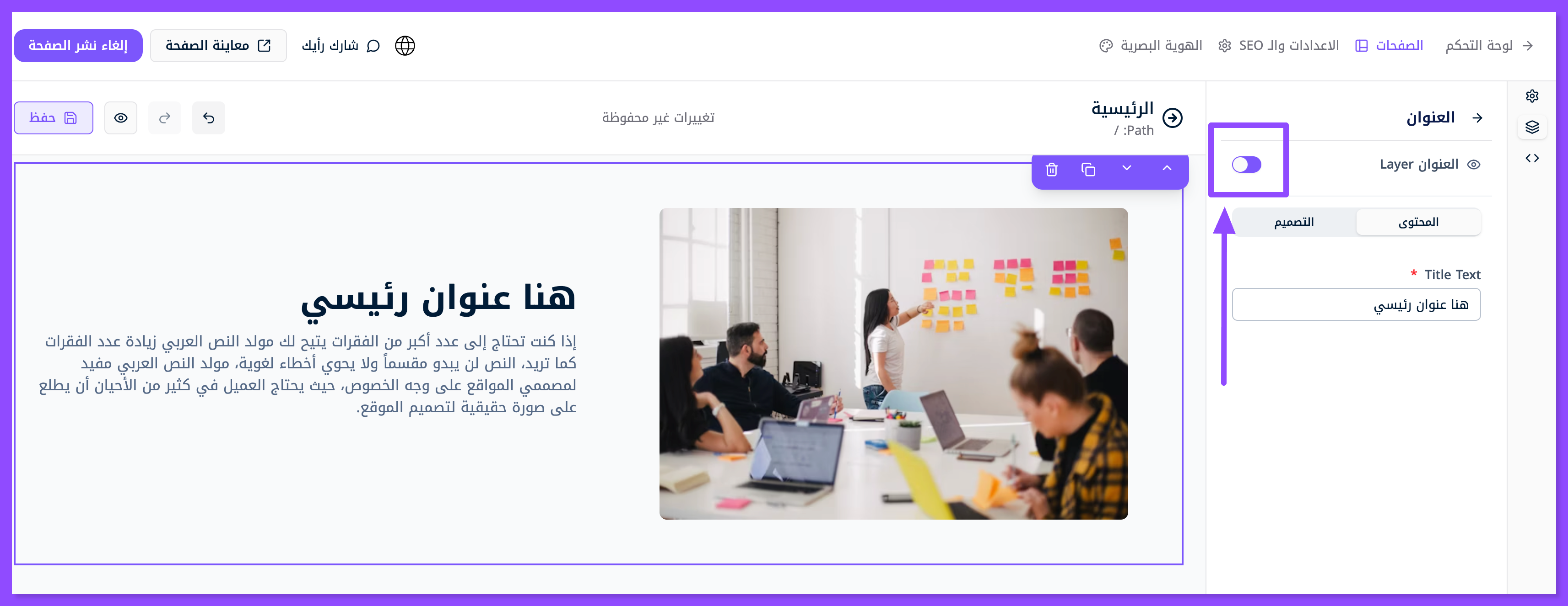 عدل العنوان الرئيسي والعنوان البارز والوصف مباشرةً من خلال نافذة الطبقات, منها إلى نافذة المحتوى.