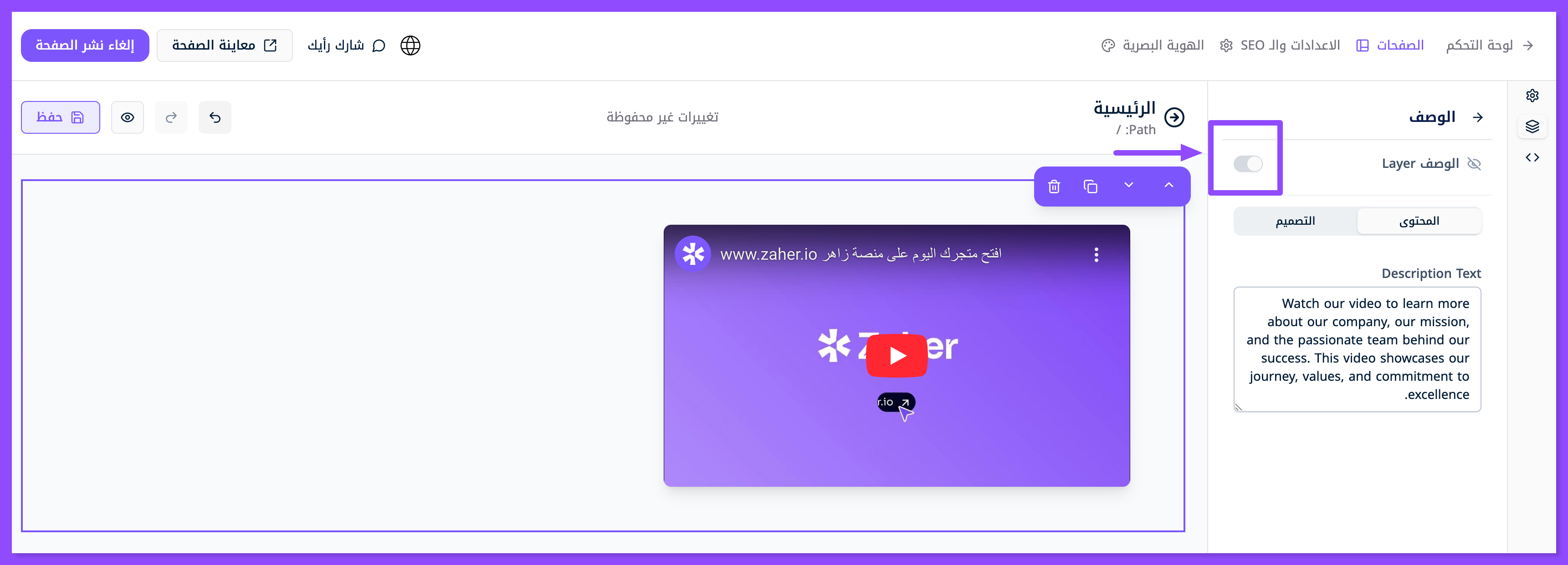 اضغط على زر تعديل الموقع مباشرةً االظاهر باللون البنفسجي للوصول إلى صفحات موقعك.