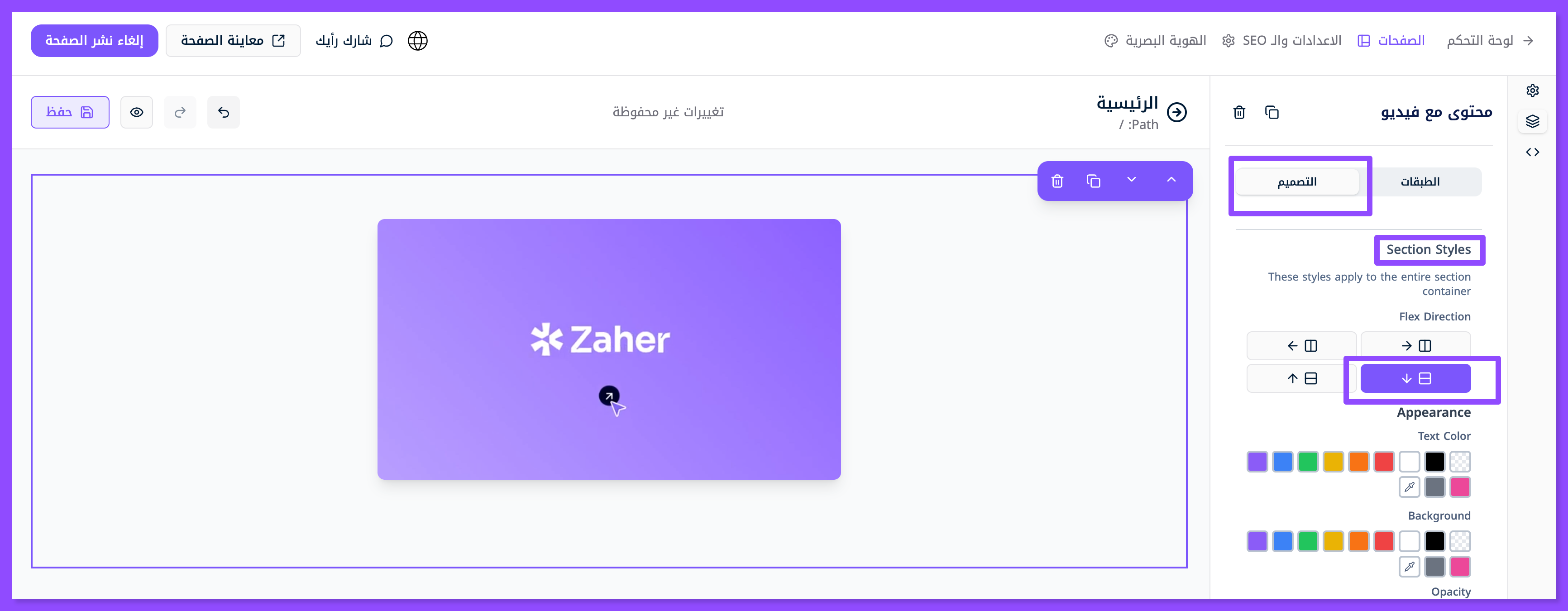 لتنصيص الفيديو إذهب لنافذة التصميم، تحديدًا قسم Section style ومنه تلاعب بمحاذاة الفيديو من أعلى إلى أسفل.