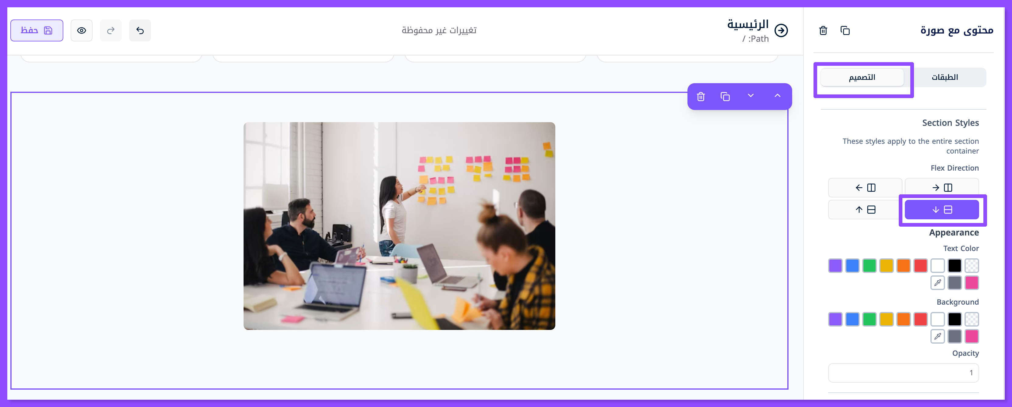 ولتنصيص الصورة إذهب لنافذة التصميم، تحديدًا قسم Section style ومنه تلاعب بمحاذاة الصورة من أعلى إلى أسفل.