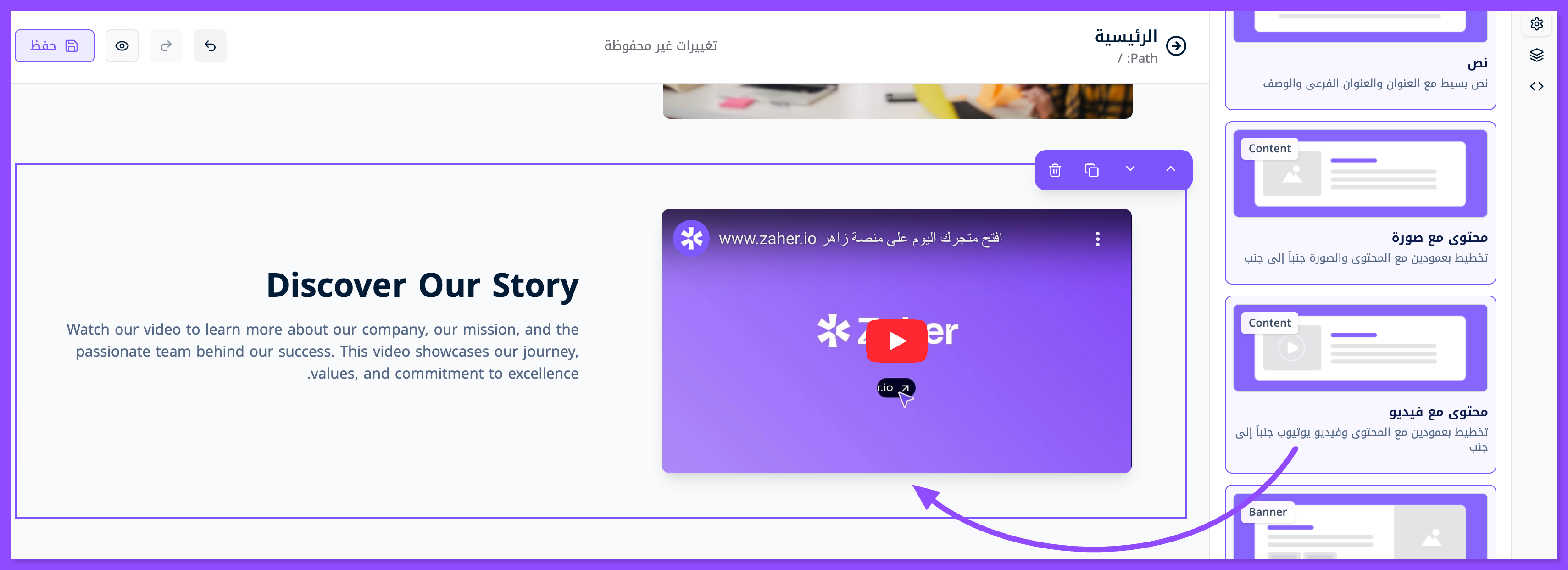 لتخصيص محتوى معين لكل فيديو في معرض أعمالك، ابحث عن قسم محتوى مع فيديو واسحبه وأفلته في الموقع الذي تريده.