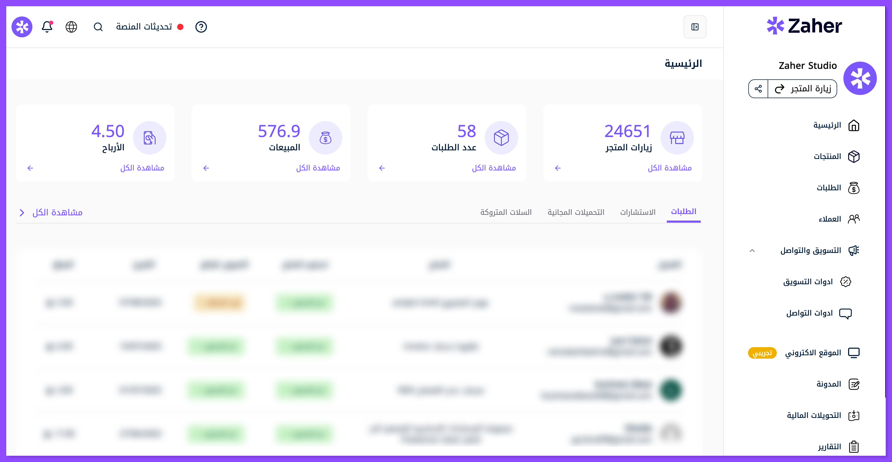 توجه إلى لوحة التحكم الخاصة بمتجرك بعد تسجيل الدخول.