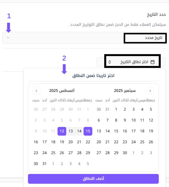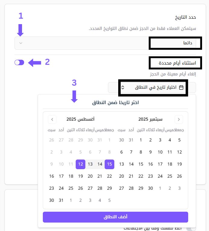 وبعد التفعيل، اضغط على اختيار تاريخ في النطاق من التقويم، وحدد الأيام التي تريد منع الحجز فيها.