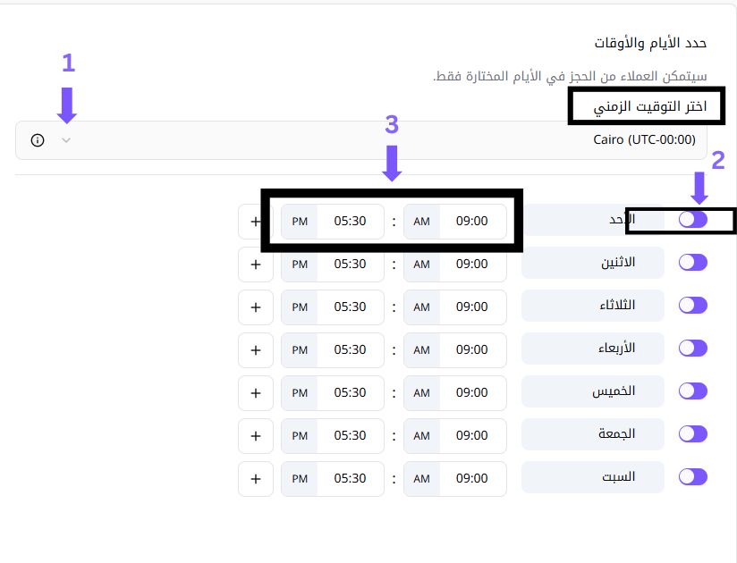 اختر التوقيت الزمني المناسب لموقعك الجغرافي من القائمة المنسدلة أعلى القسم، مثل "Cairo (UTC+02:00)"، لضمان عرض المواعيد بشكل صحيح للعملاء.