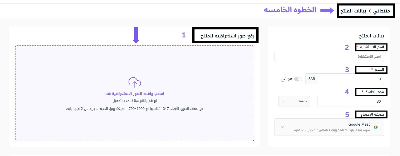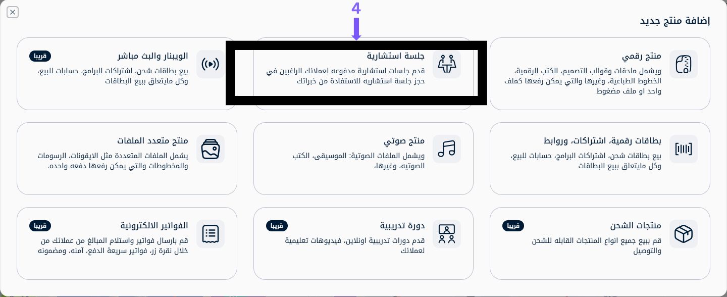 4- تحديد نوع المنتج :-اختر جلسة استشارية لتظهر لك الإعدادات الخاصة بهذا النوع من المنتجات.