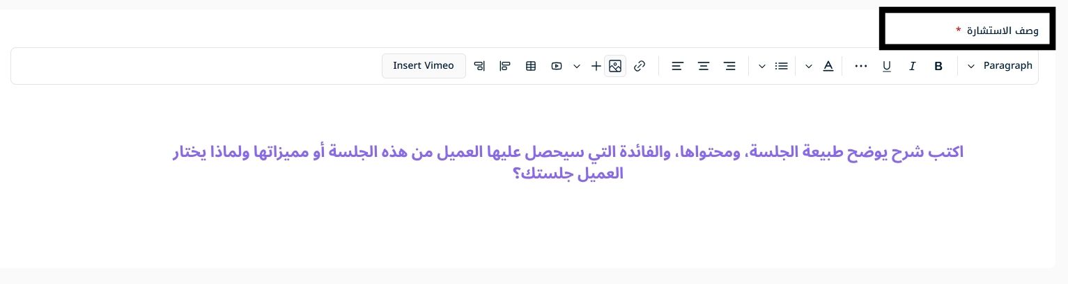 رفع الصور الاستعراضية:اسحب وأفلت صورة لجلسة الاستشارة داخل مربع الرفع، أو اضغط لرفع الصور من جهازك، والتزم بالمواصفات الموضحة (الحجم والصيغة).