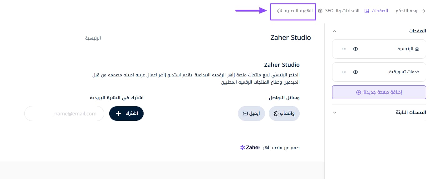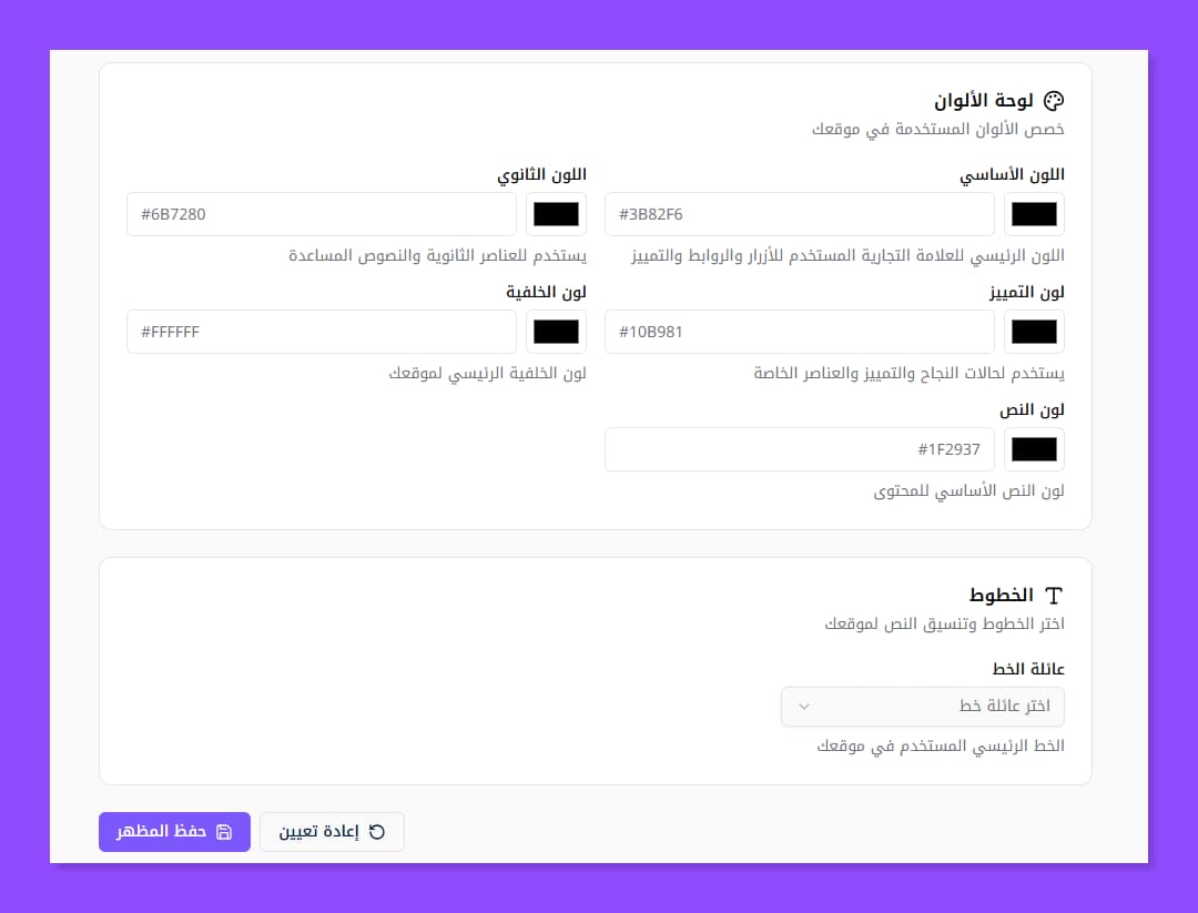 تظهر لك هذه النافذة، التي تستطيع من خلالها إدخال عناصر الهوية البصرية الخاصة بك كالألوان والخطوط لتظهر لك عندما تبدأ في أي تصميم في موقعك.