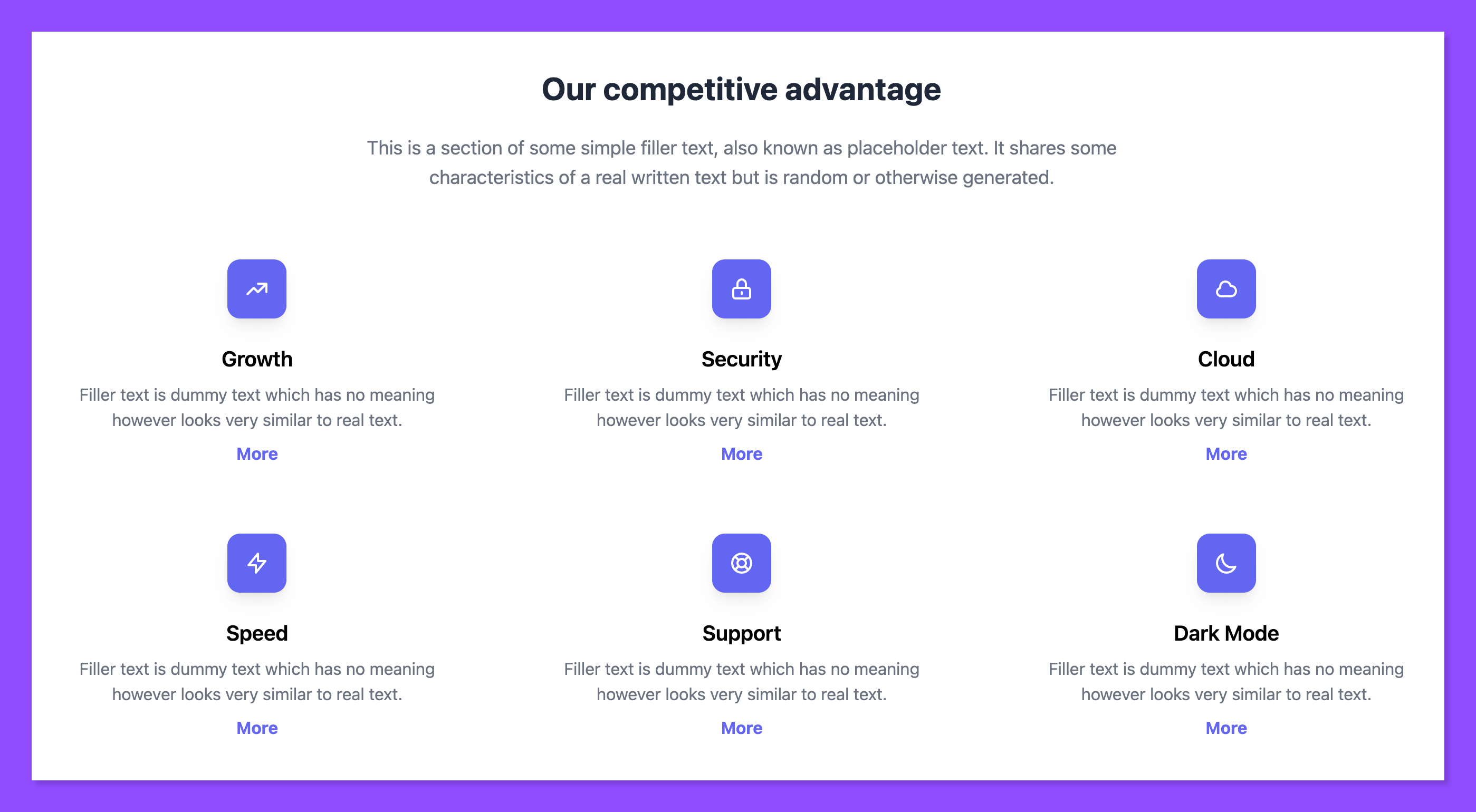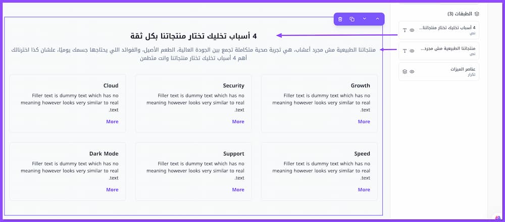 سكشن أو قسم المزايا هو الجزء الذي يبني الثقة ويبرز القيمة في موقعك/ متجرك، فعندما يرى الزائر مزايا واضحة ومرتبة لما تُقدم، سوف يفهم مباشرةً لماذا يجب أن يختارك بدلاً من منافسيك.