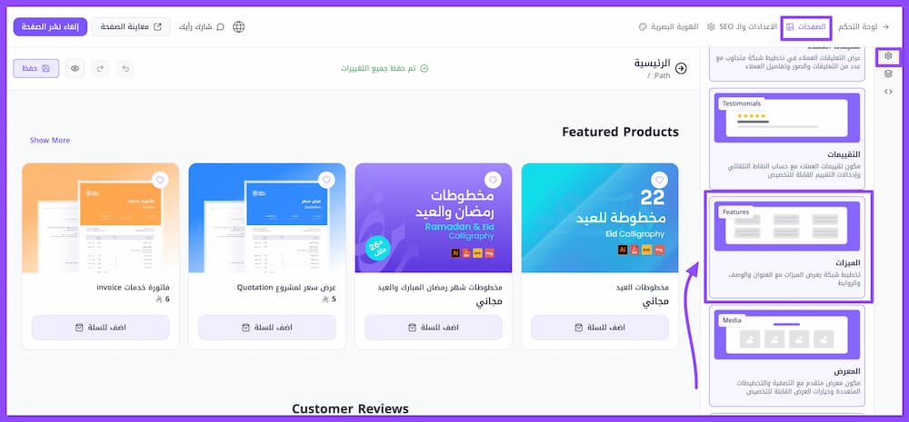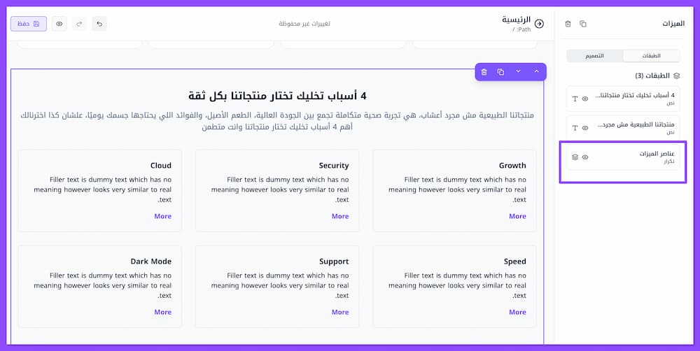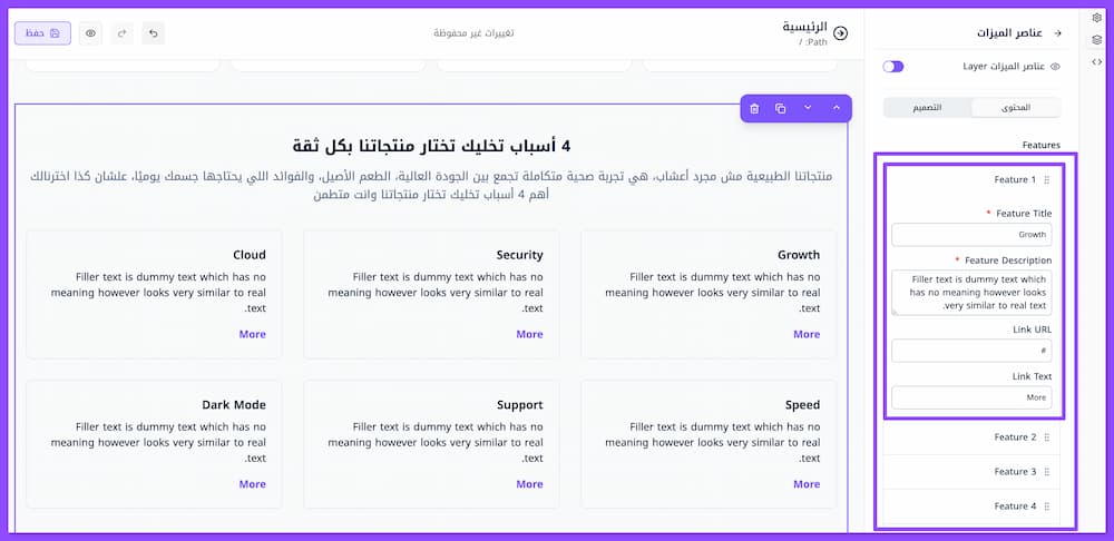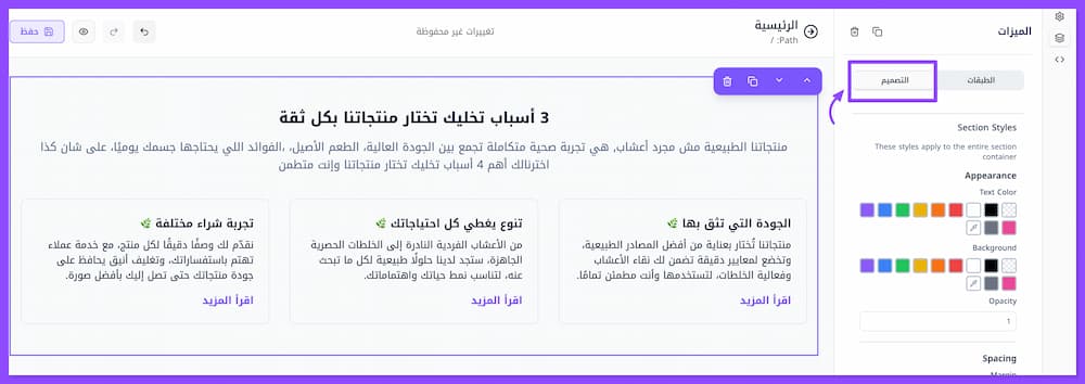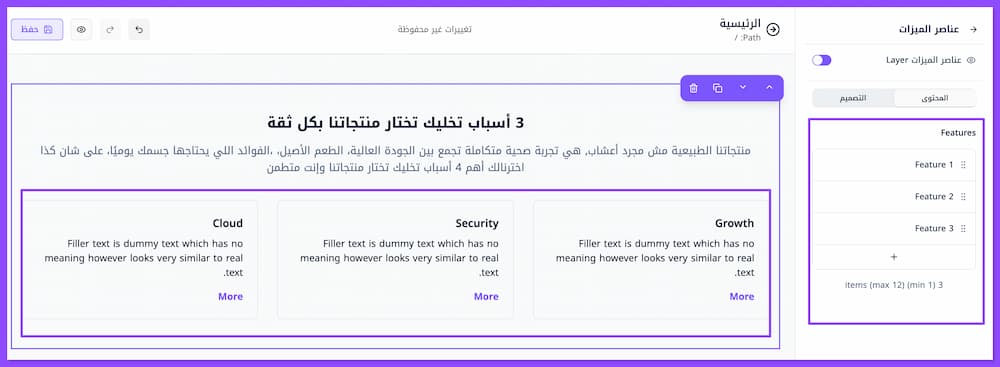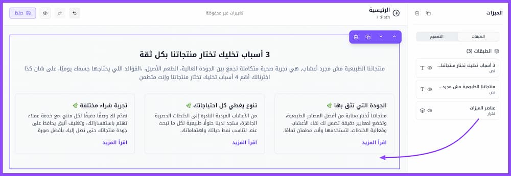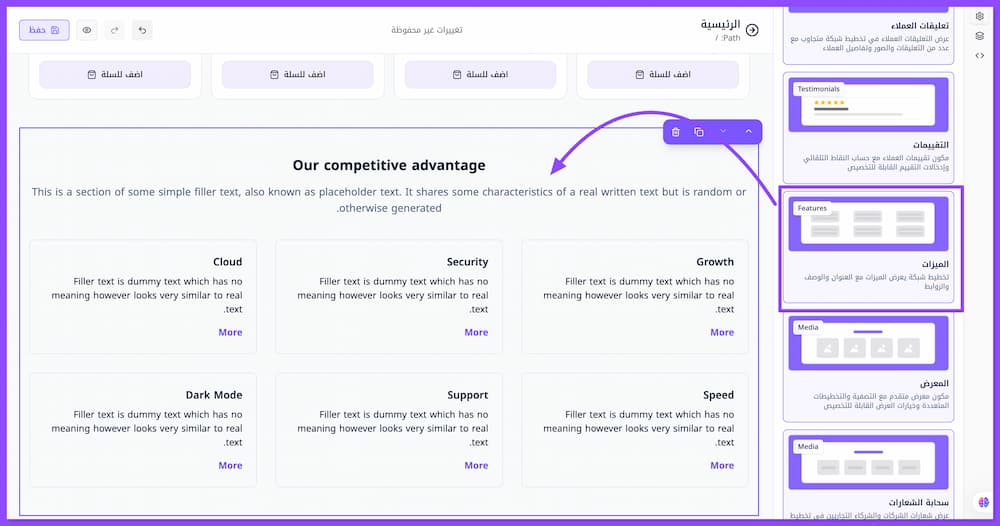 اتبع الطريقة التالية لتخصيص وتصميم قسم المزايا في موقعك: