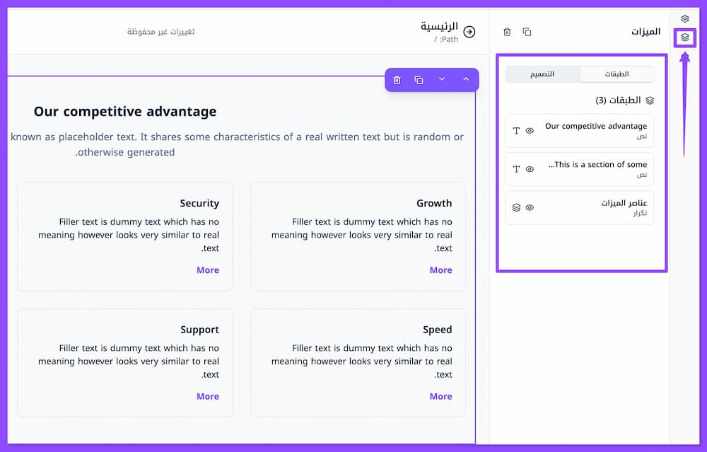 6- اضغط على القسم لتعديله، أو اضغط على أيقونة الطبقات الظاهرة آقصى يسار الشاشة إن لم تظهر نافذة التعديل.