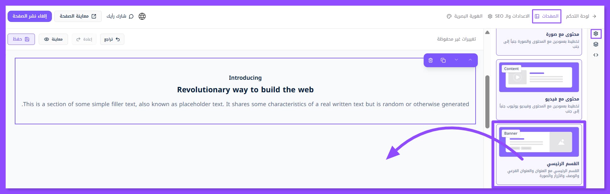 5- اسحب وافلت القسم الرئيسي في القسم الفارغ (اضغط، اسحب، افلت)، ،ما يميز القسم الرئيسي من ناحية التصميم هو وجود عنوان رئيسي وعنوان فرعي وعنوان علوي وأزرار بارزة لتوجيه العميل نحو الإجراء المطلوب.