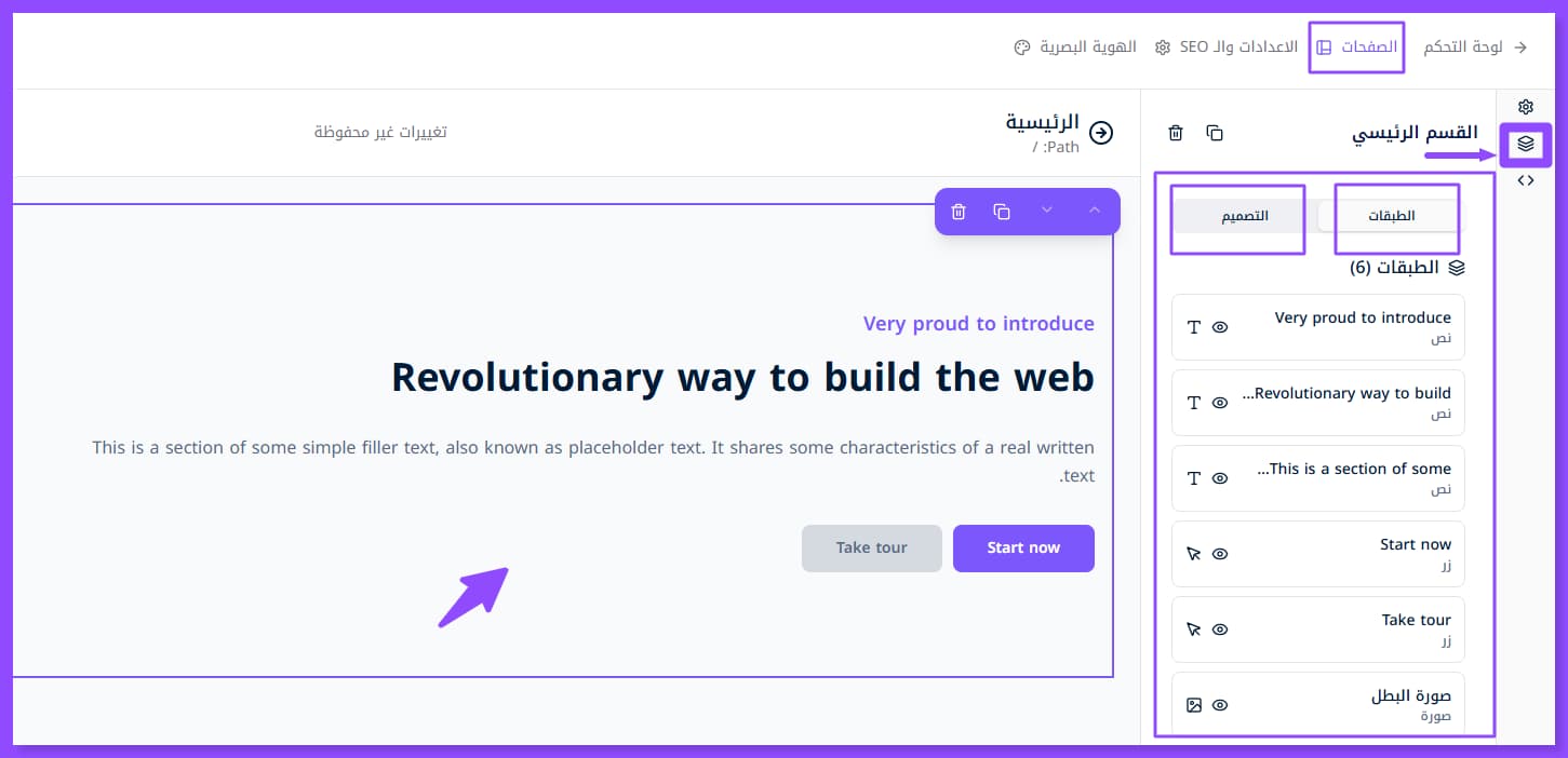 5- اضغط على القسم الذي أضفته لتظهر لك نافذة تعديله، أو إضغط على أيقونة الطبقات الظاهرة في اليمين إذا لم تظهر لك نافذة التعديل.