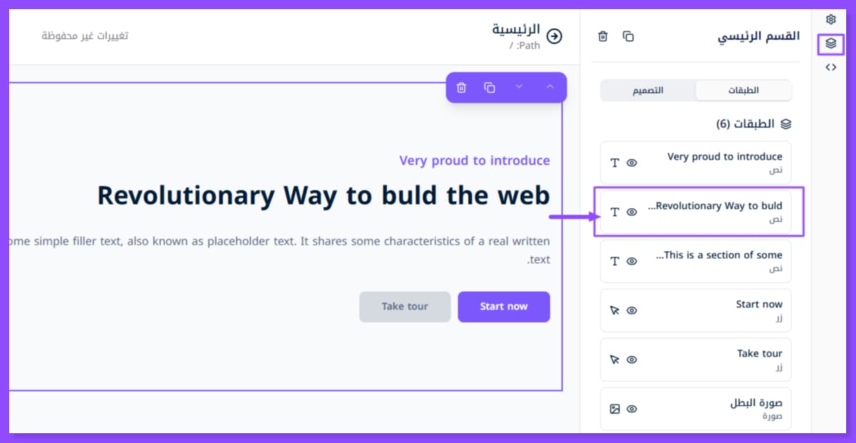 4- افعل الأمر نفسه مع كل الطبقات، سواءً لتعديل النص داخل الأزرار أو النصوص الفرعية الموجودة كلها.