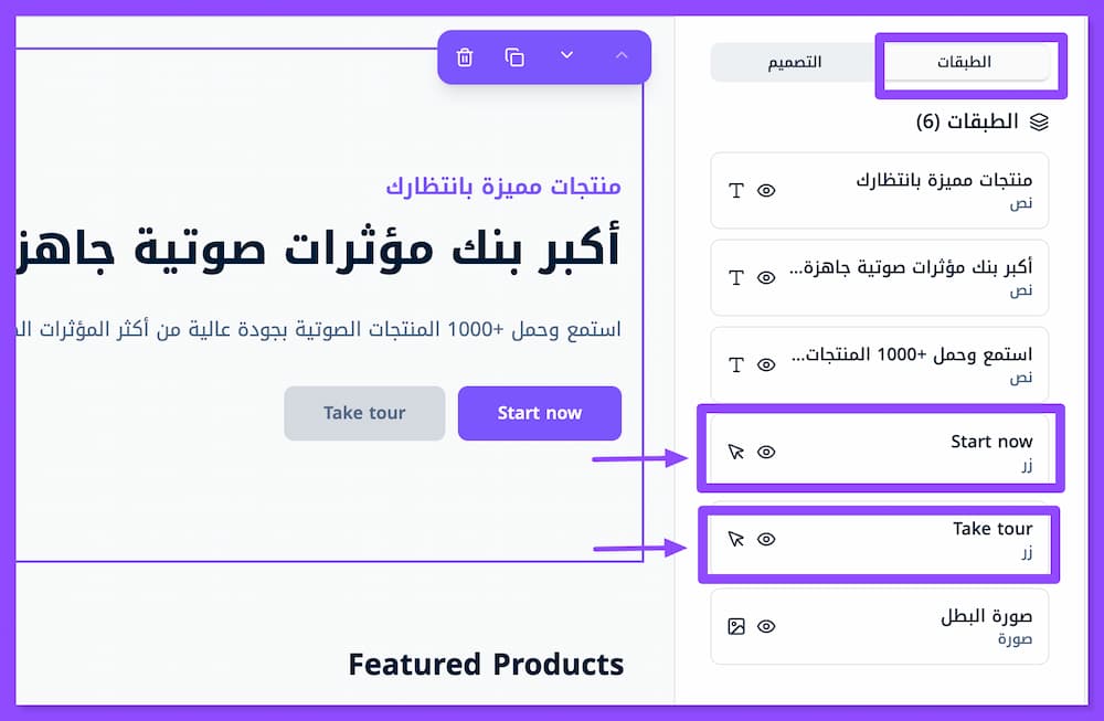 الأزرار جدًا مهمة لتوجيه العميل للاتجاه المناسب، ولتعديل نصها والرابط الخاص بها اتبع الطريقة التالية: