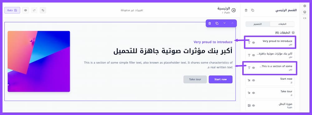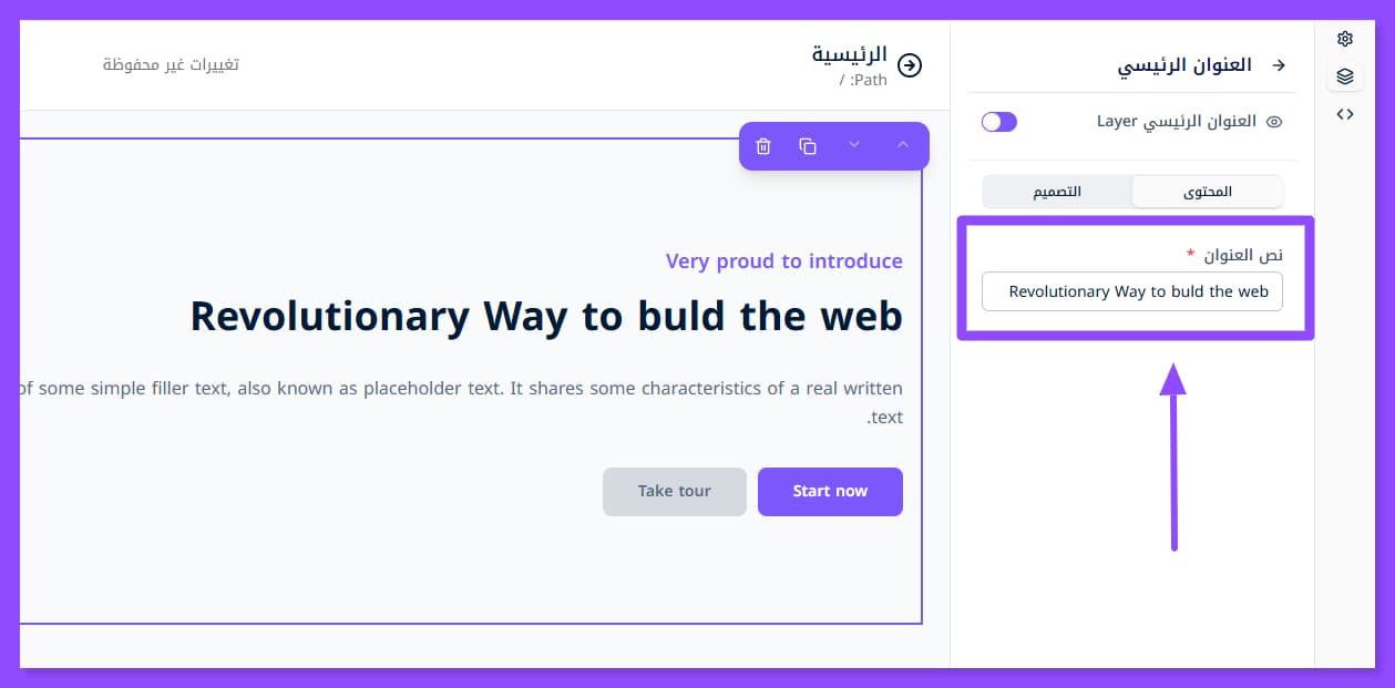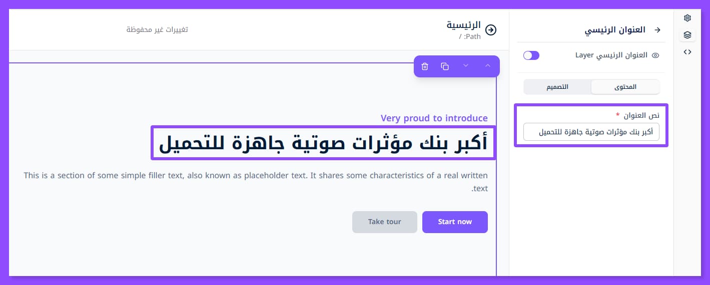 3- استبدل النص الذي يعبر عن مشروعك ليظهر معدلاً بشكل تلقائي في القسم الرئيسي