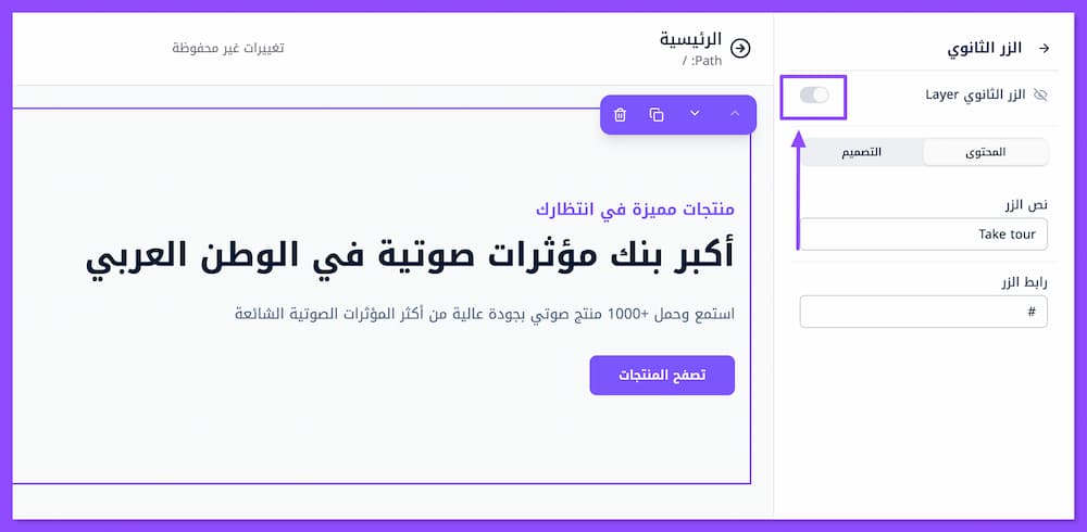 4- تستطيع الاكتفاء بزر واحد فقط، وإخفاء الزر الثاني أو كليهما موقتًا إلى حين إنشاء صفحاتهم بطريقة احترافية، وذلك عبر إلغاد تفعيل الزر الظاهر باللون البنفسجي لهذا الزر.