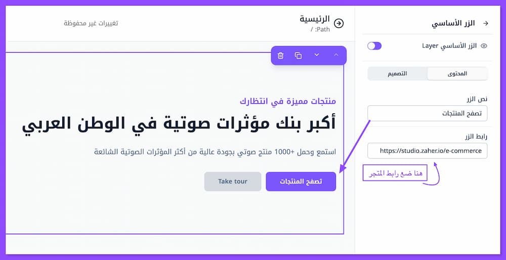 2- تظهر لك هذه النافذة حيث يمكنك تعديل نص الزر بنفسك، ووضع رابط الصفحة التي تريد ربطها به، وهنا، لأنني قمت بتسمية الزر باسم تصفح المنتجات، فإنني حتمًا أريد توجيهه لصفحة المتجر، فوضعت رابط المتجر (studio.zaher.io/e-commerce) الذي أنشأته