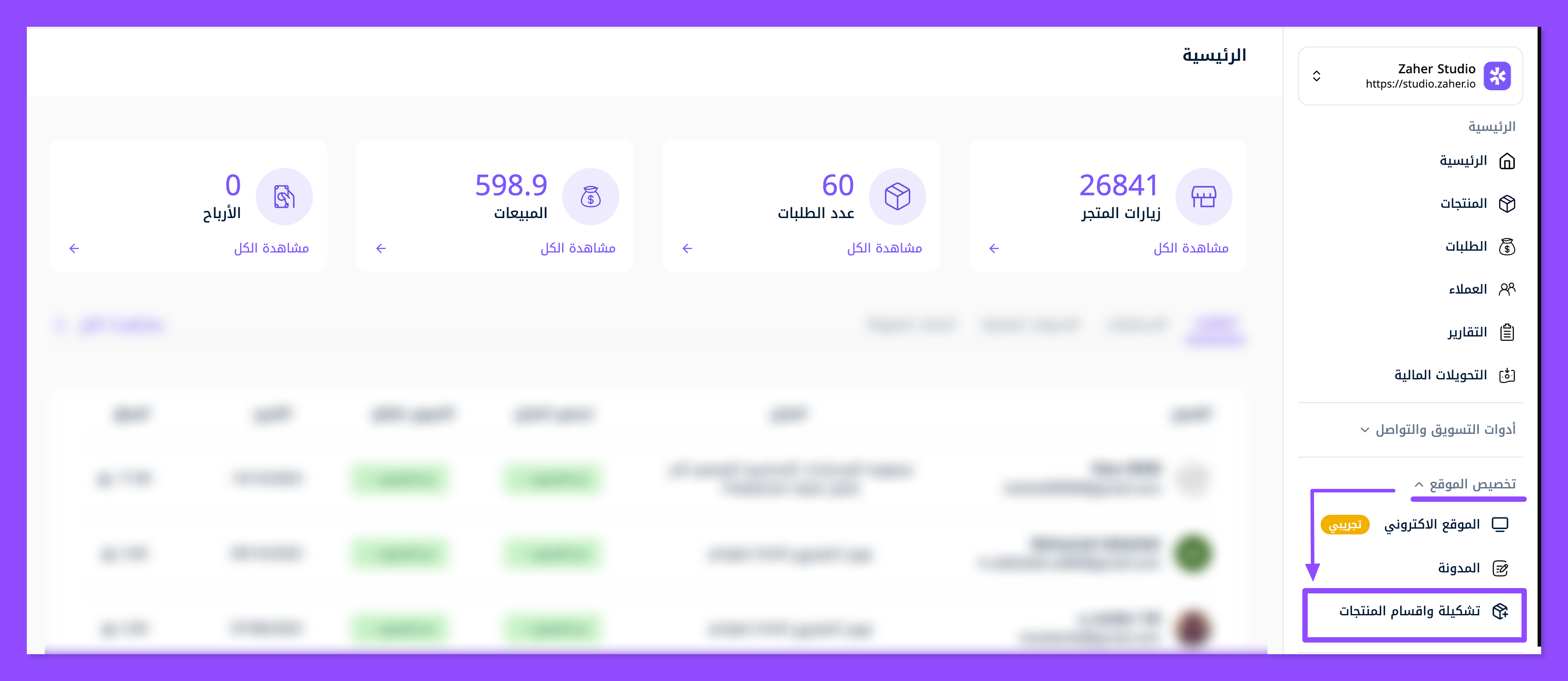 توجه إلى لوحة التحكم في متجرك، ثم توجه إلى (تخصيص الموقع) ومنها إلى (تشكيلة وأقسام المنتجات)، واضغط عليها.