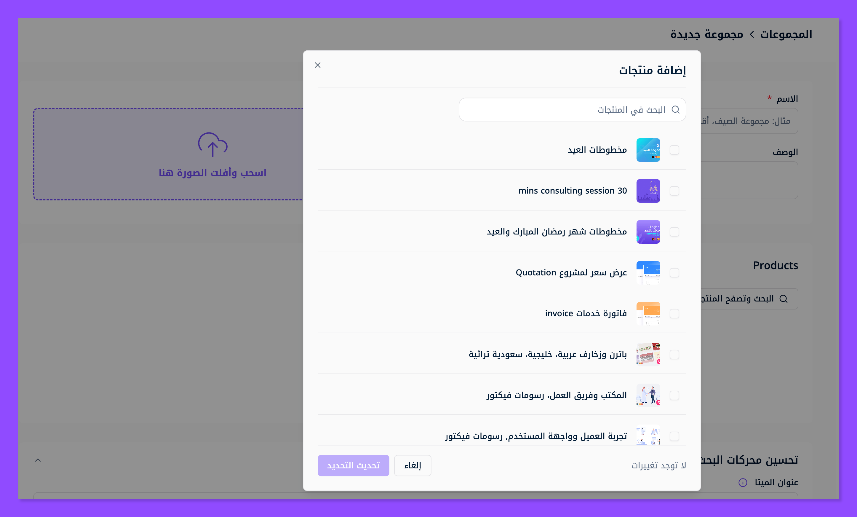 عندما تنتهي من إضافة المجموعات التي تنظم المنتجات في متجرك (من قسم تشكيلة المنتجات)، الآن اتبع الخطوات التالية: