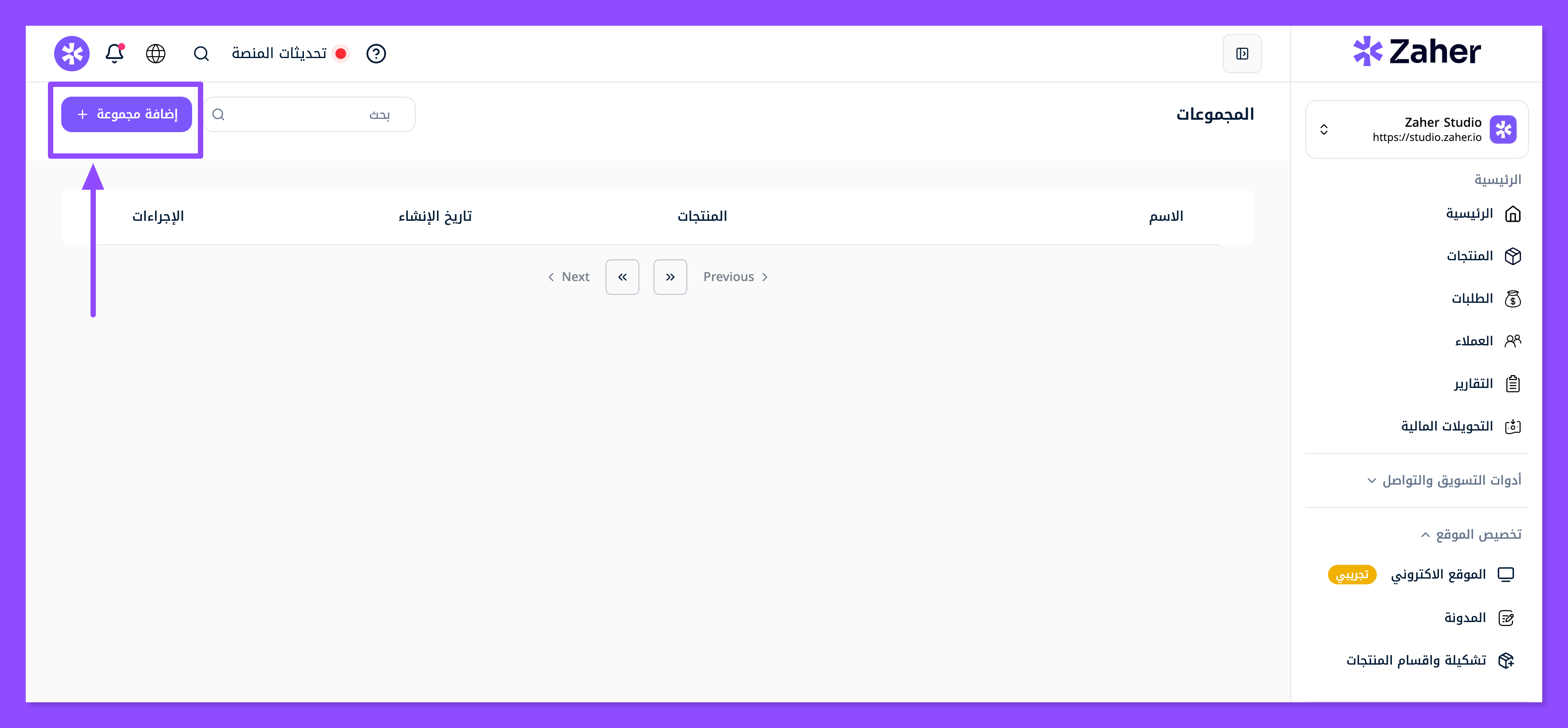 تظهر لك هذه الصفحة حيث يمكنك إضافة مجموعة بسهولة، وهنا اضغط على زر (إضافة مجموعة) أقصى يسار الشاشة لتبدأ إضافة أول مجموعة لك في المتجر.