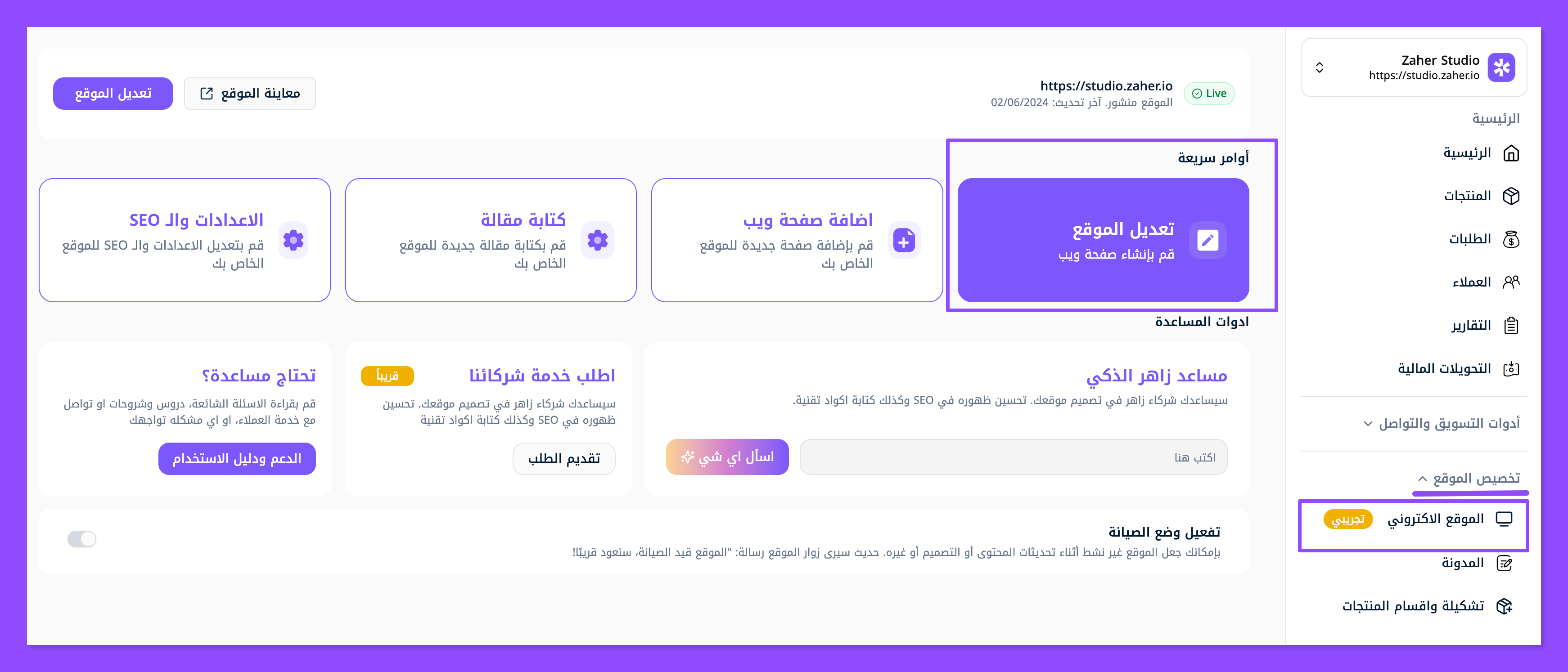 توجه إلى قسم الموقع الإلكتروني ومنها مباشرةً اضغط على تعديل الموقع.