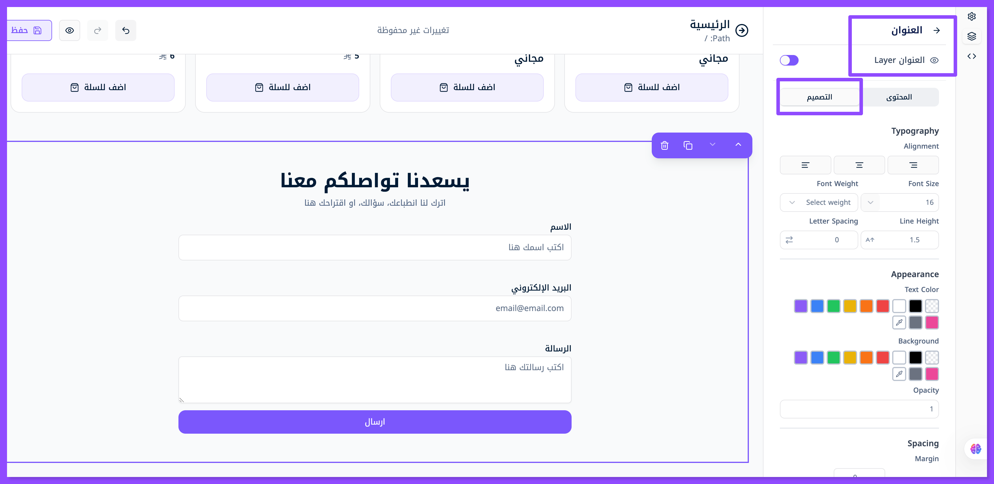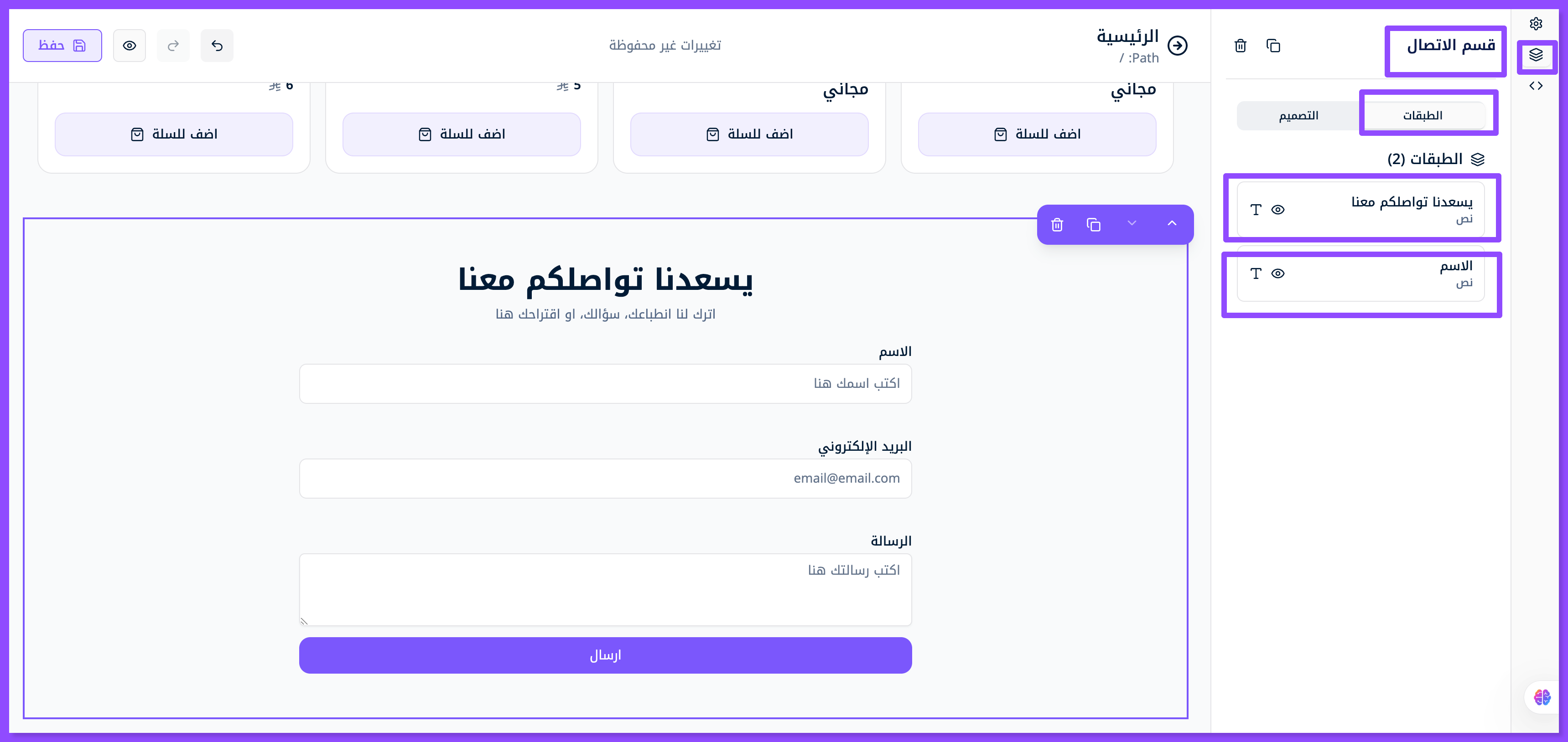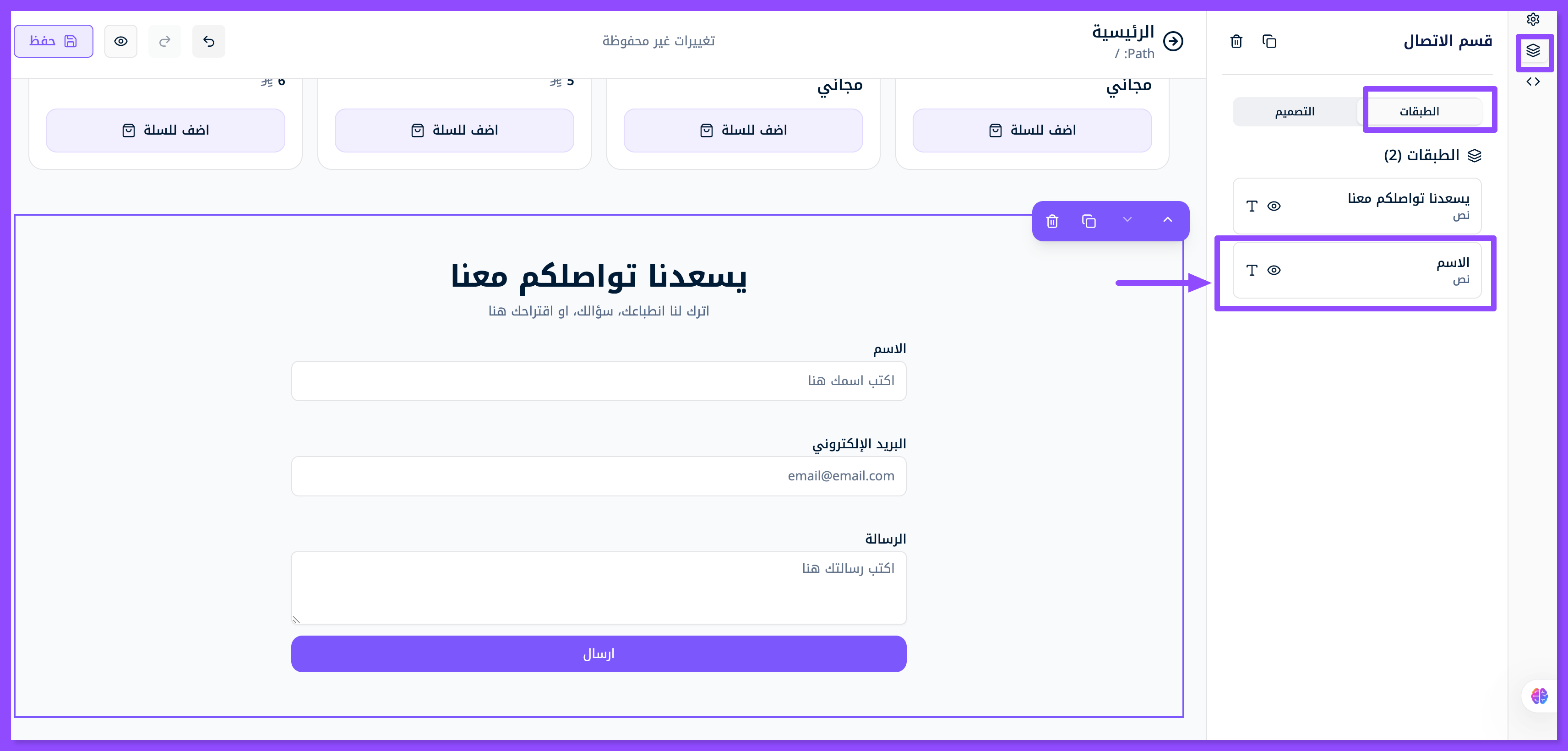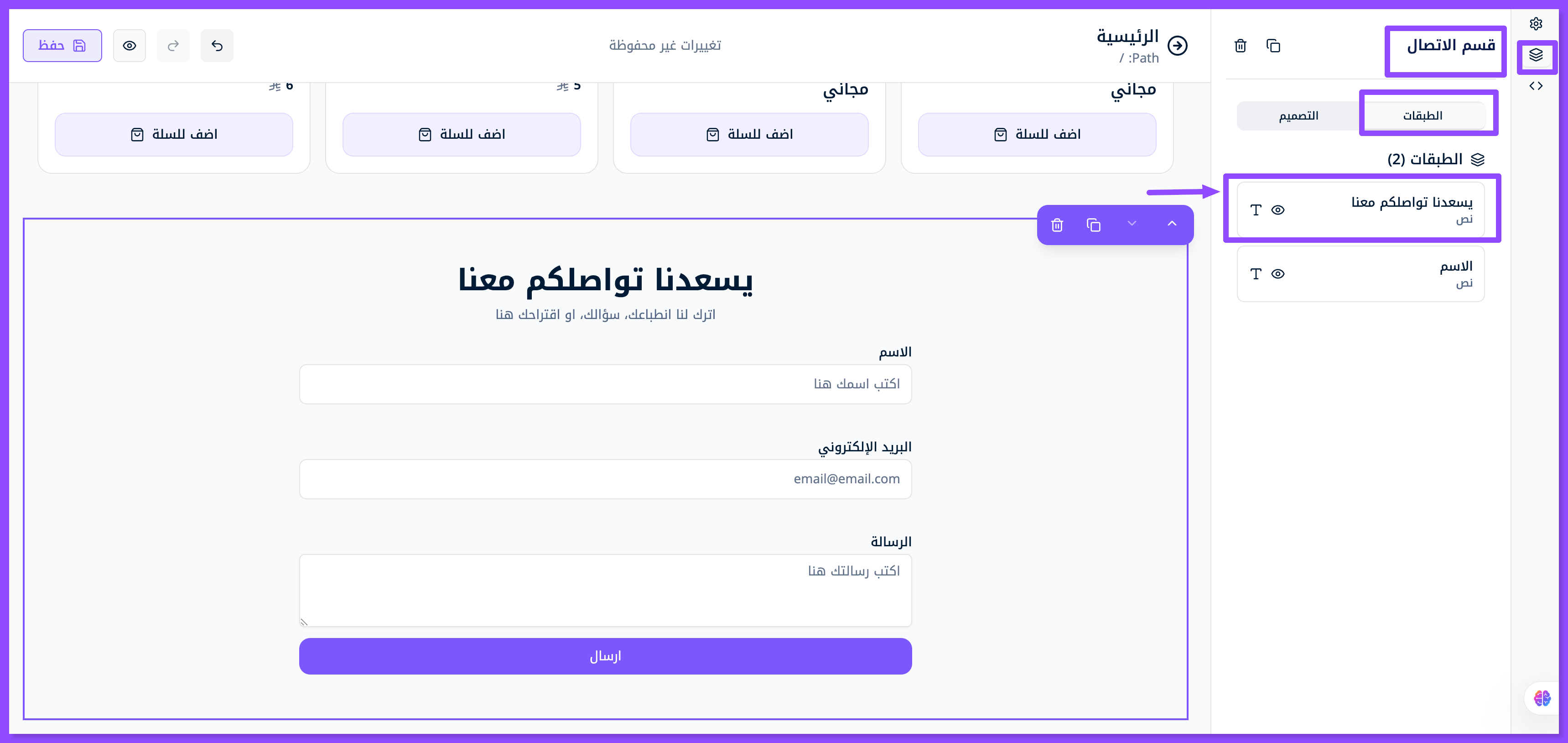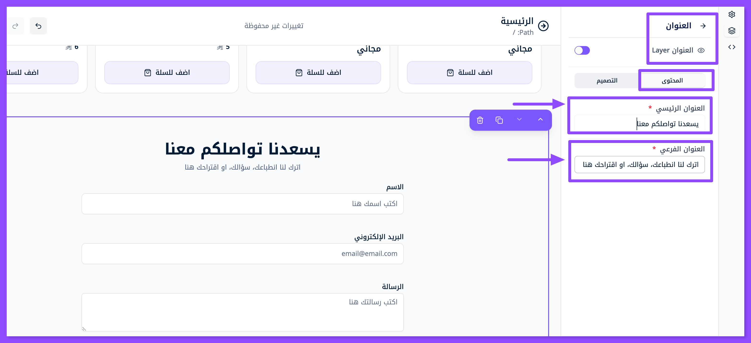 اضغط على الطبقة الأولى الظاهرة في الصورة, لتبدأ تعديل العنوان الرئيسي "يسعدنا تواصلكم معنا" والعنوان الفرعي الذي يليها واستبدلها بعنوانك الخاص