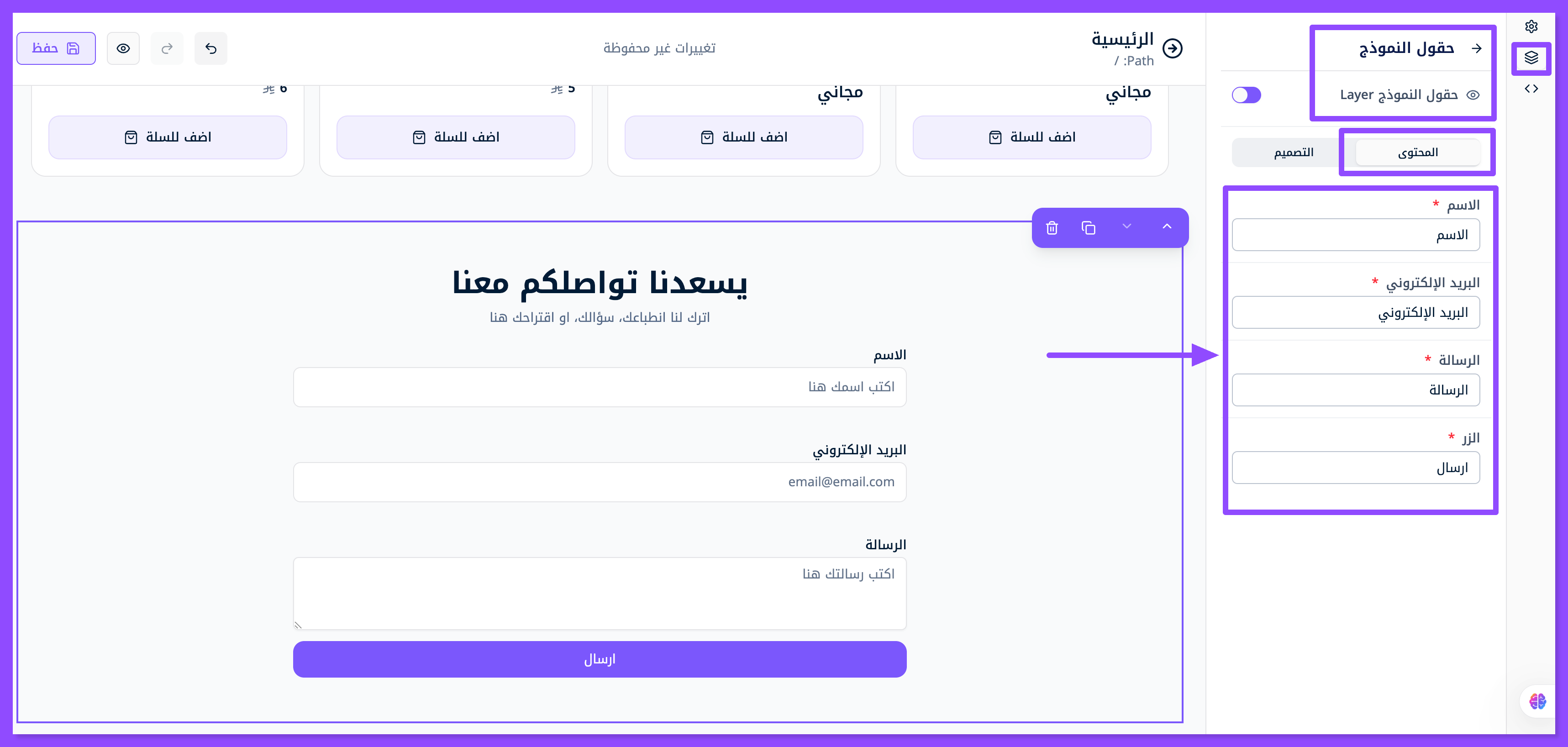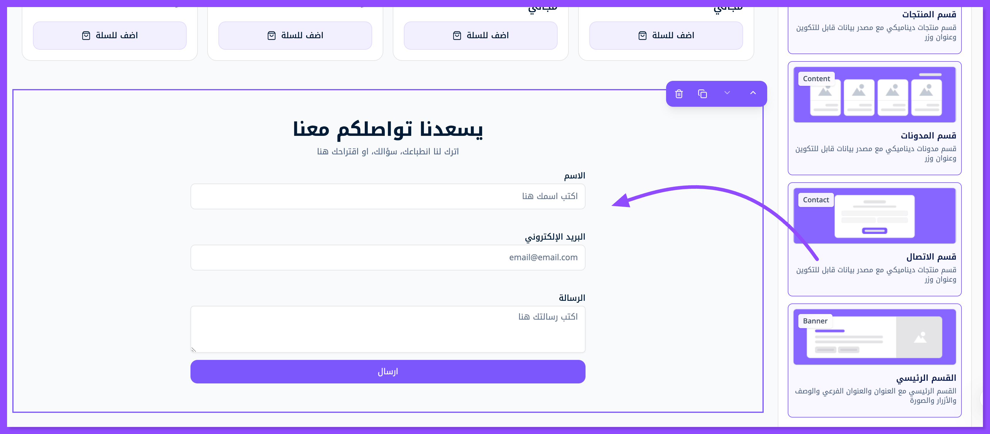 ابحث عن قسم الاتصال (Contact Section) بين الأقسام الجاهزة للاستخدام في الموقع الإلكتروني واسحبه وافلته.