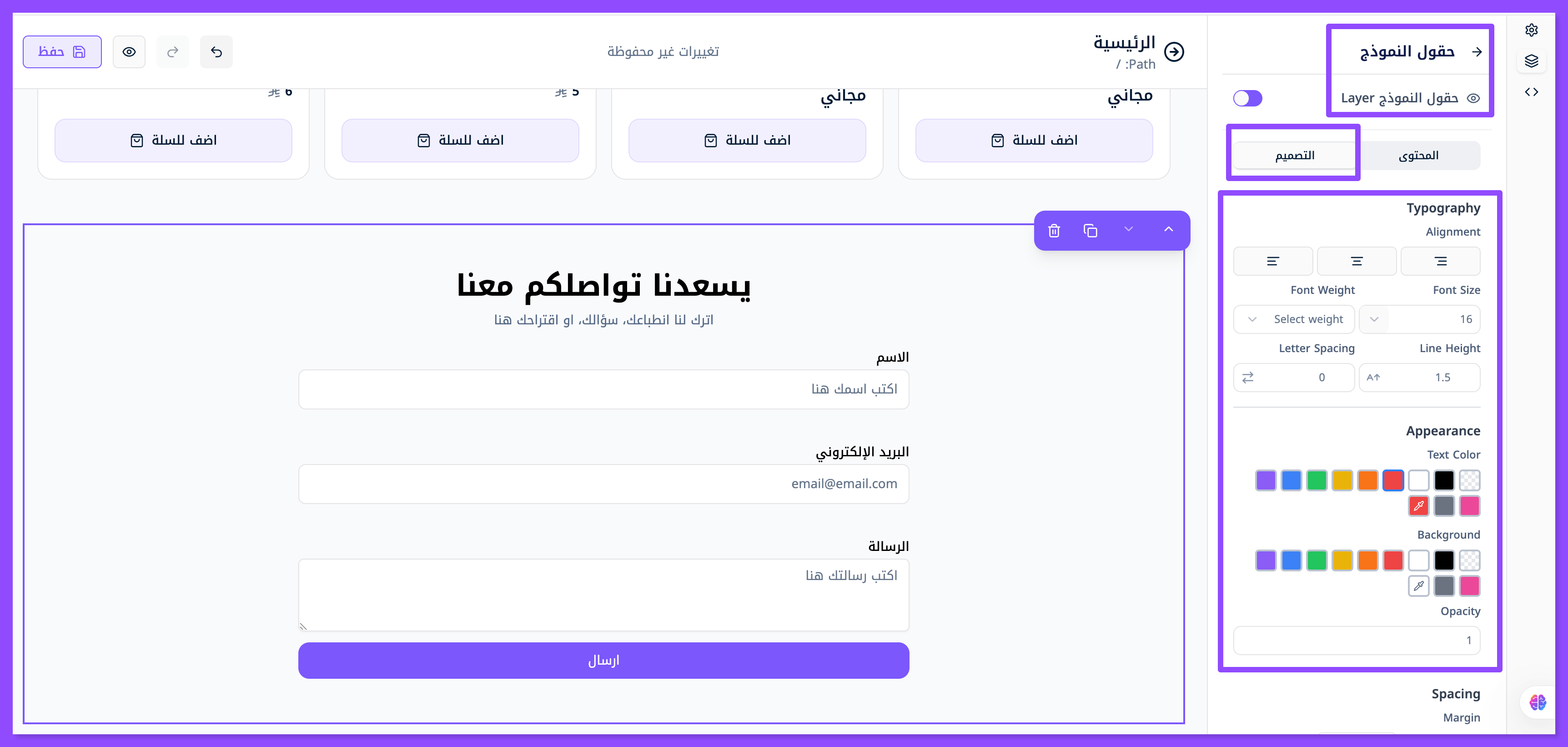 لتغيير تصميم حقول النموذج توجه إلى نافذة التصميم, وابدأ في تخصيص لون الخط وحجمه وثقله ومحاذاته وغير ذلك الكثير.