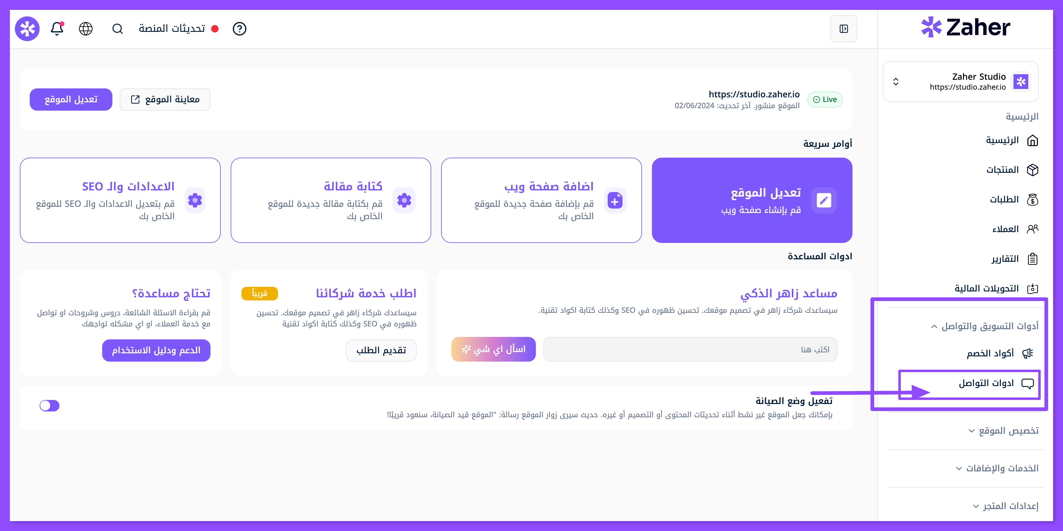 ارجع إلى لوحة التحكم الخاصة بك من زاهر.