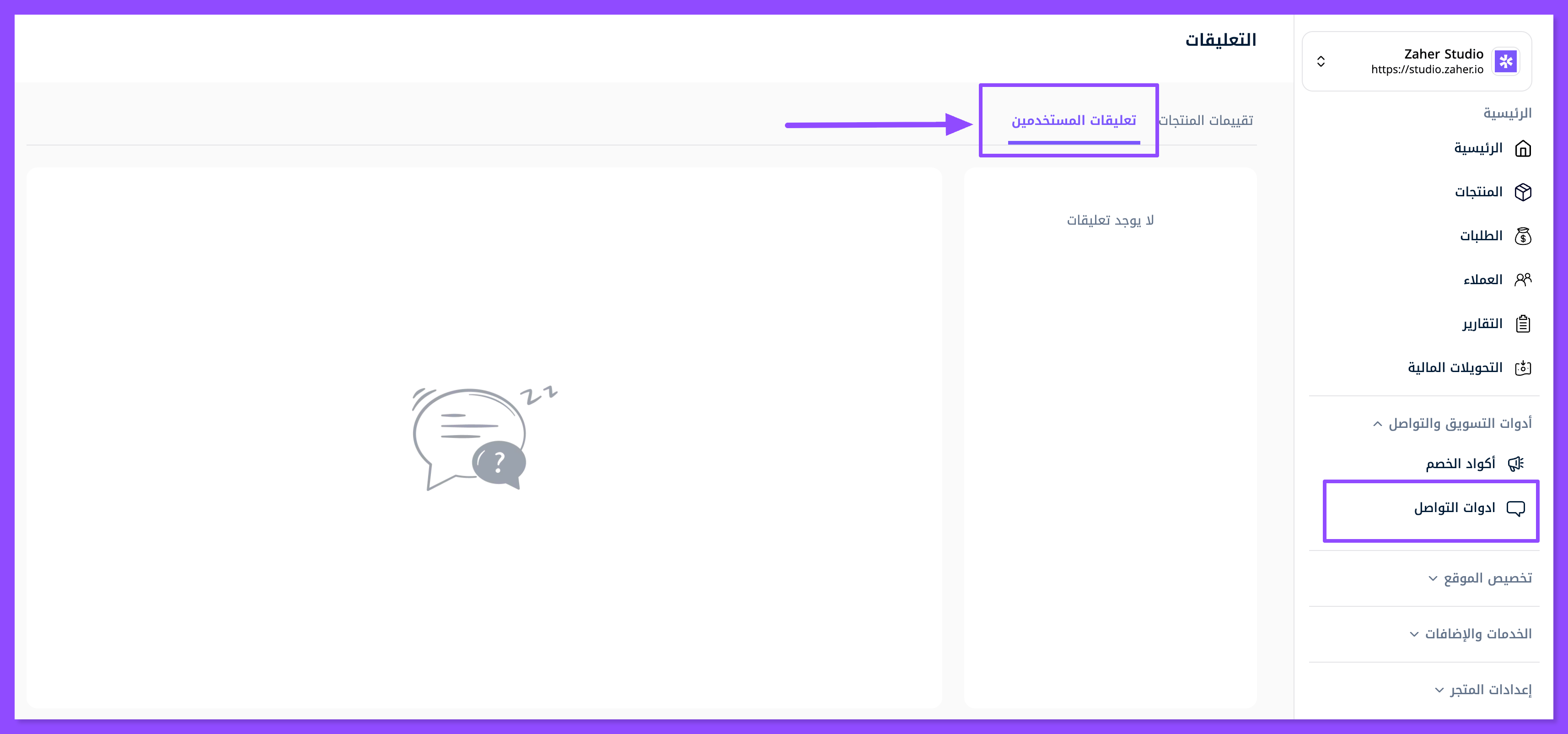 توجه لقسم تعليقات المستخدمين، حيث تجد أي رسالة أو استفسار تركه عميلك مع بريده الإلكتروني، ولا تنسَ أنك تستطيع الوصول إلى كل ذلك بكل سهولة عبر تطبيق زاهر على جوالك.