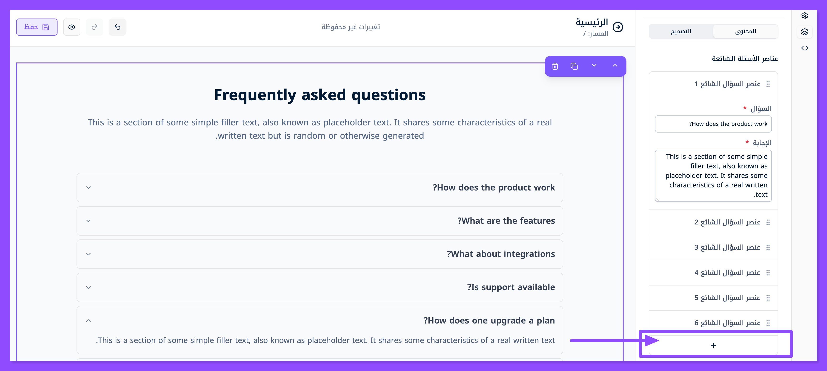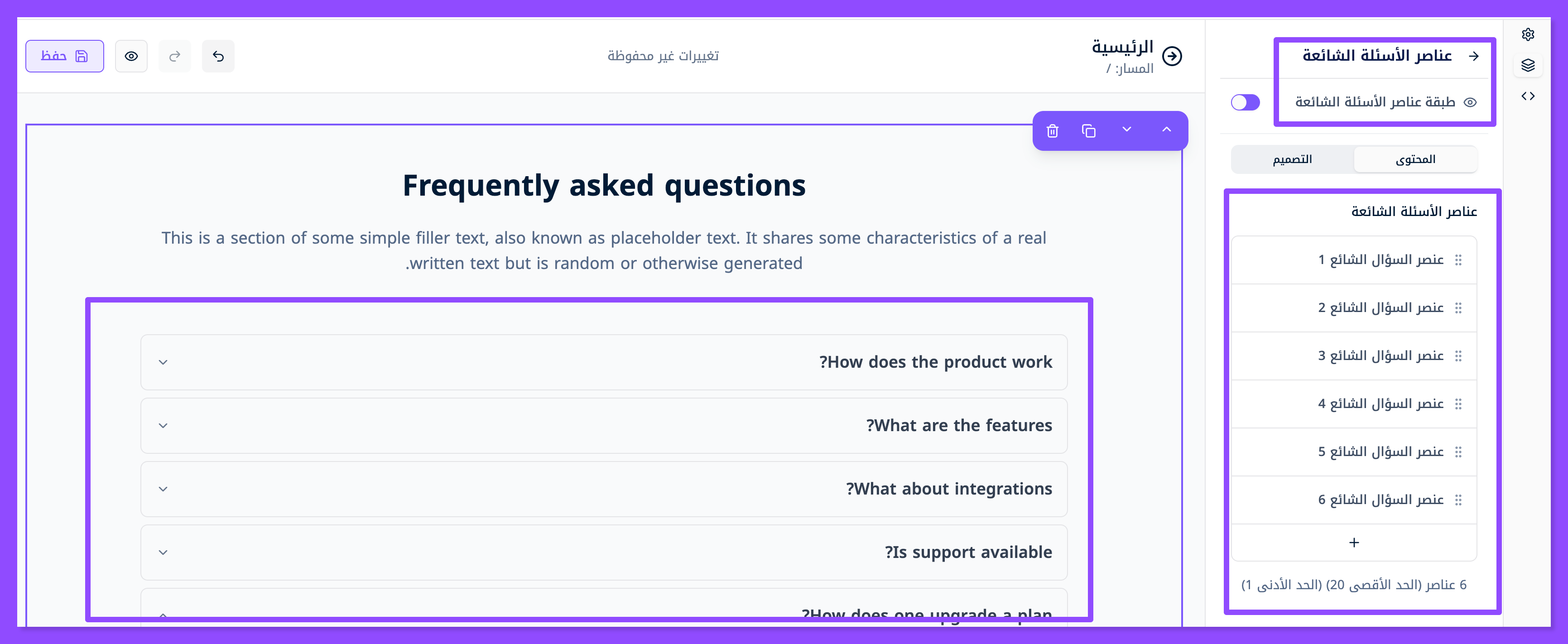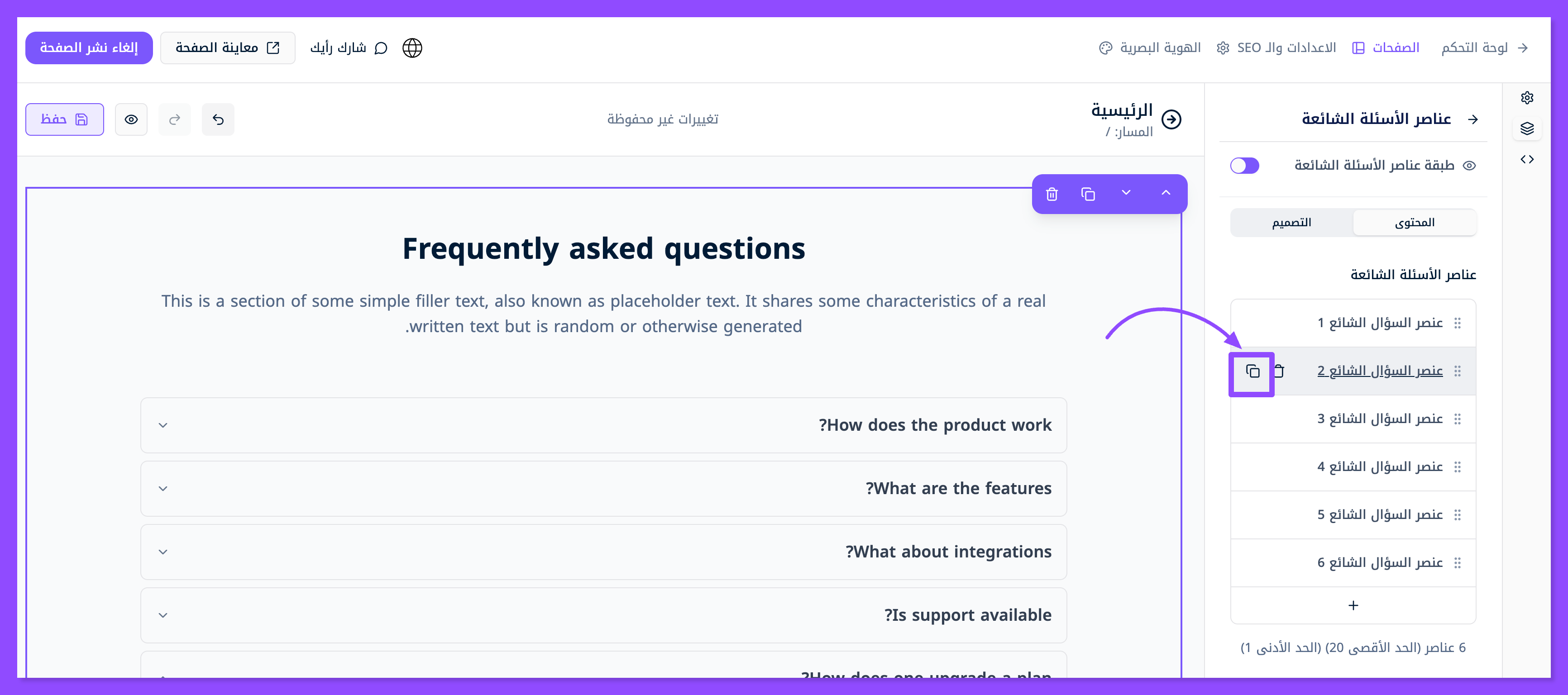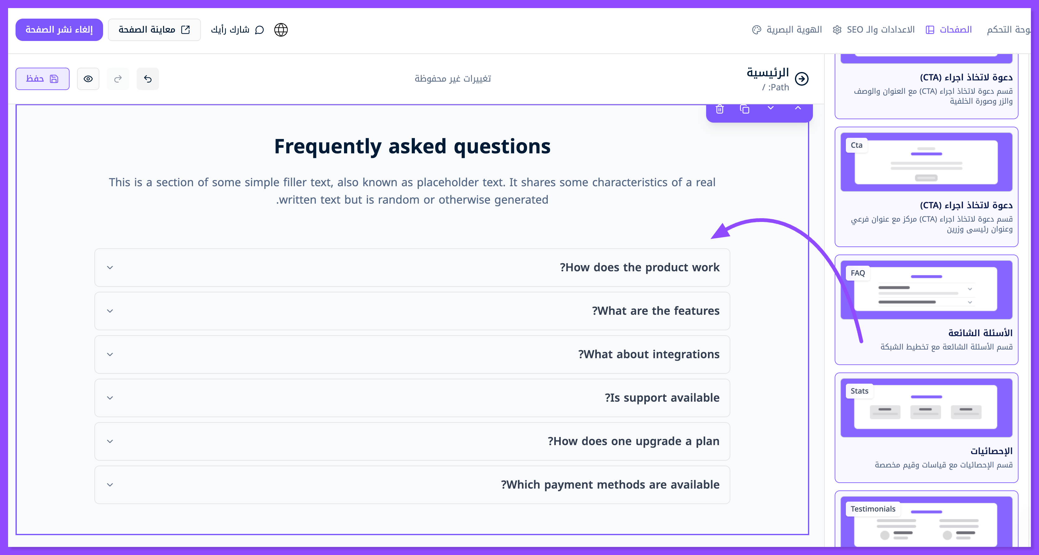 ابحث عن قسم الأسئلة الشائعة واسحبه وافلته في المكان الذي تريده من موقعك.