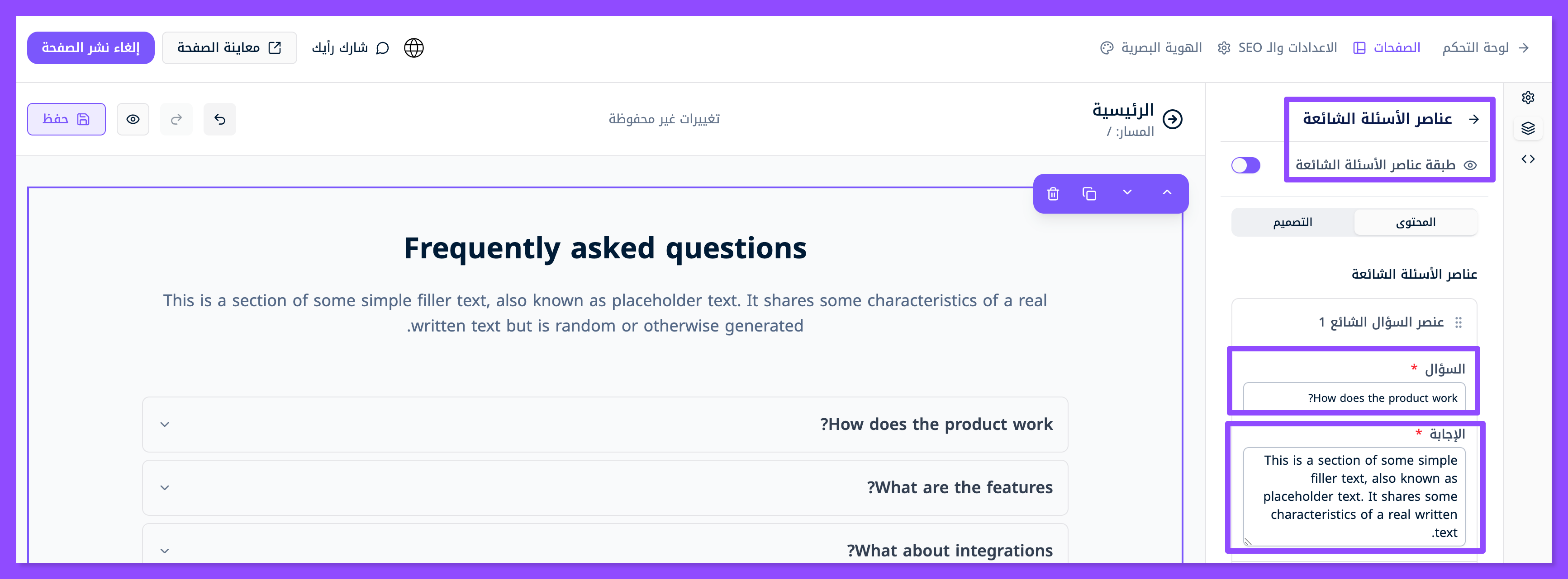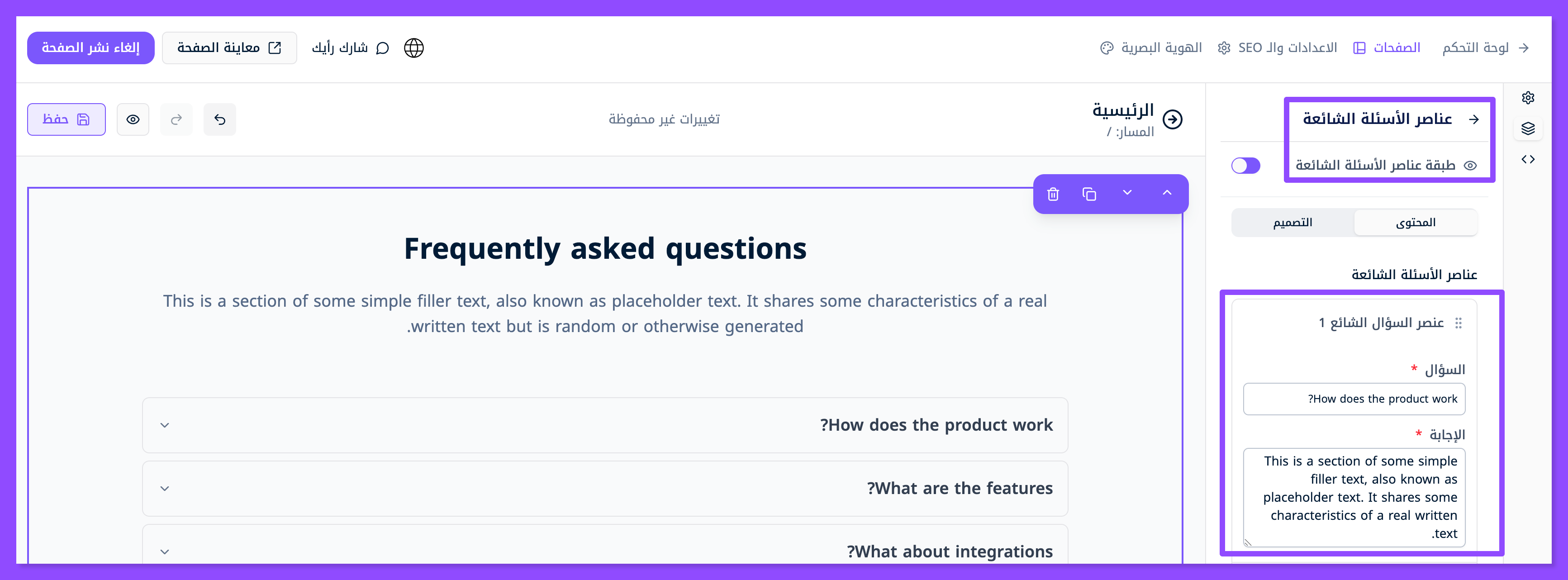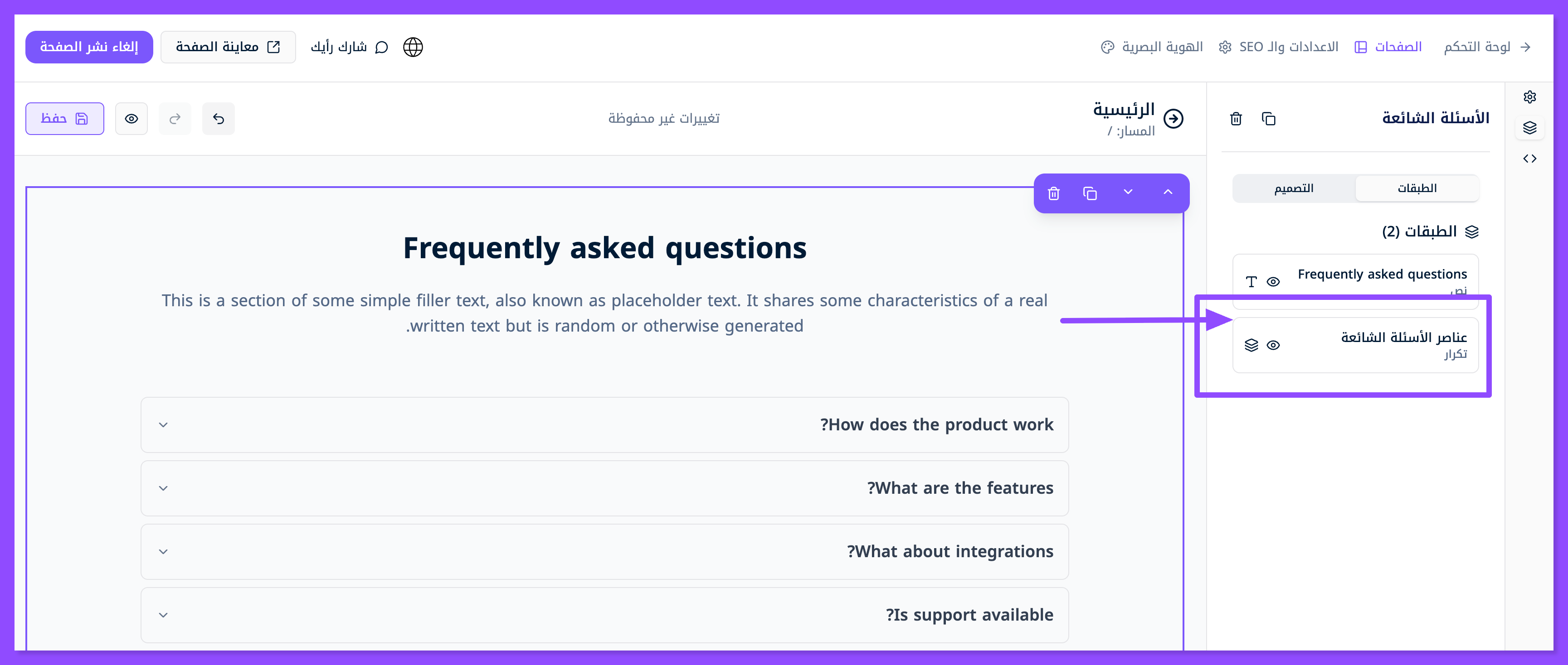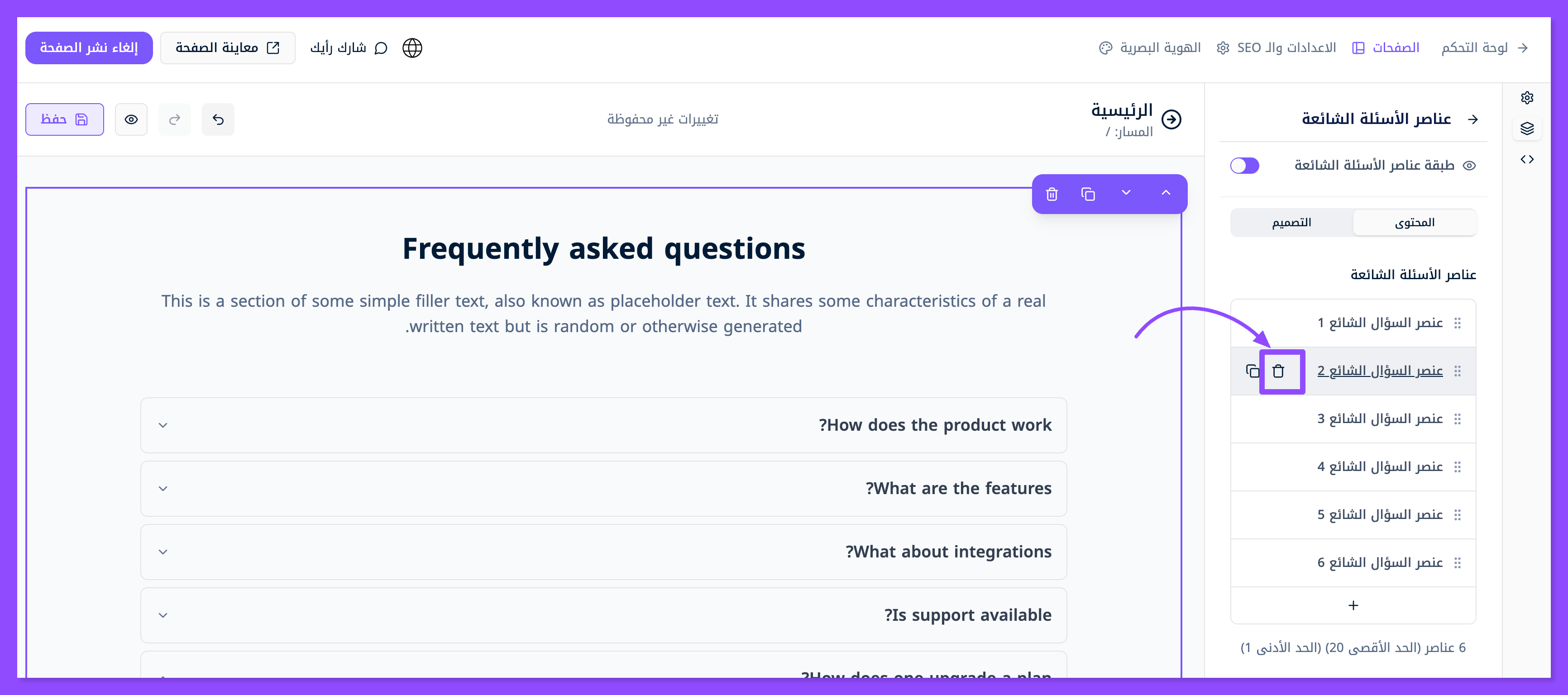 ابحث عن قسم الأسئلة الشائعة واسحبه وافلته في المكان الذي تريده من موقعك.