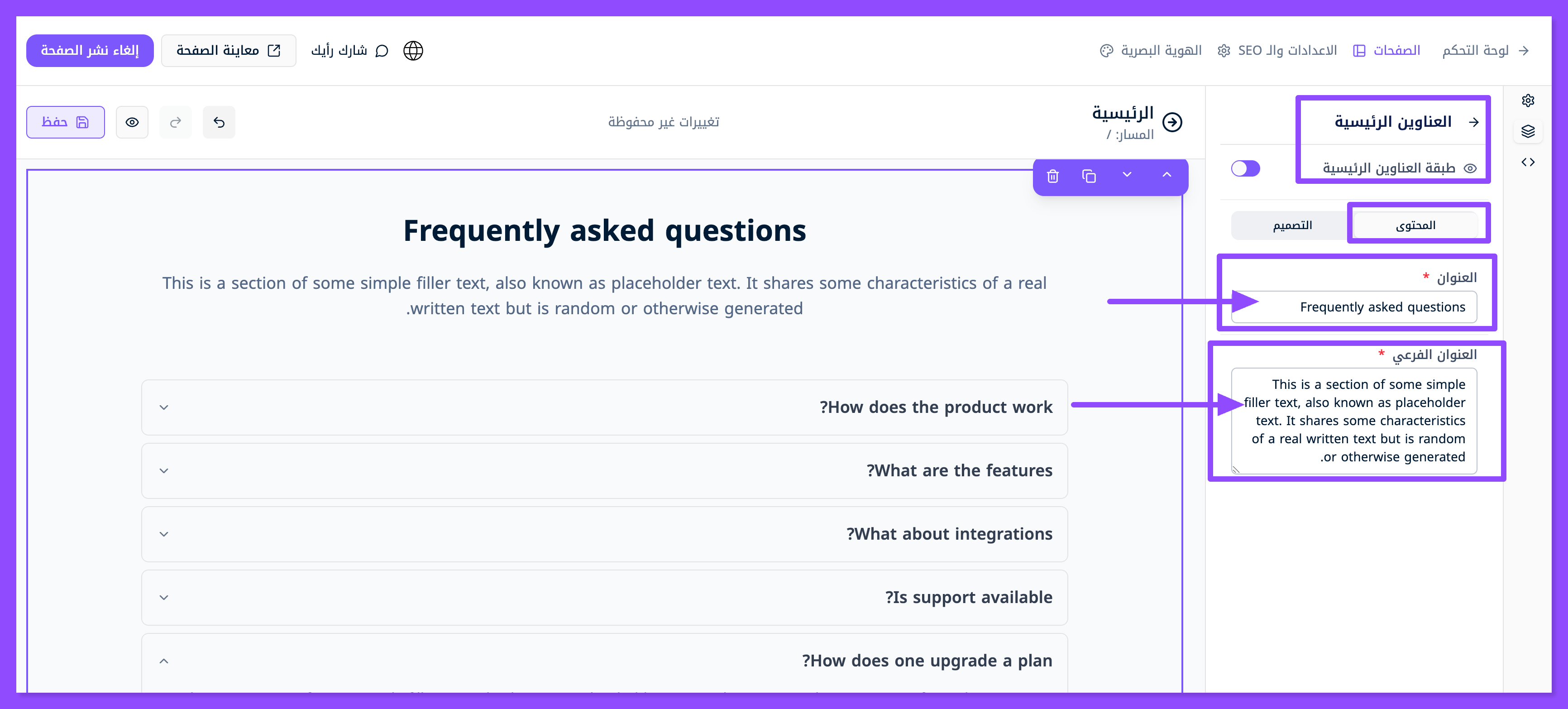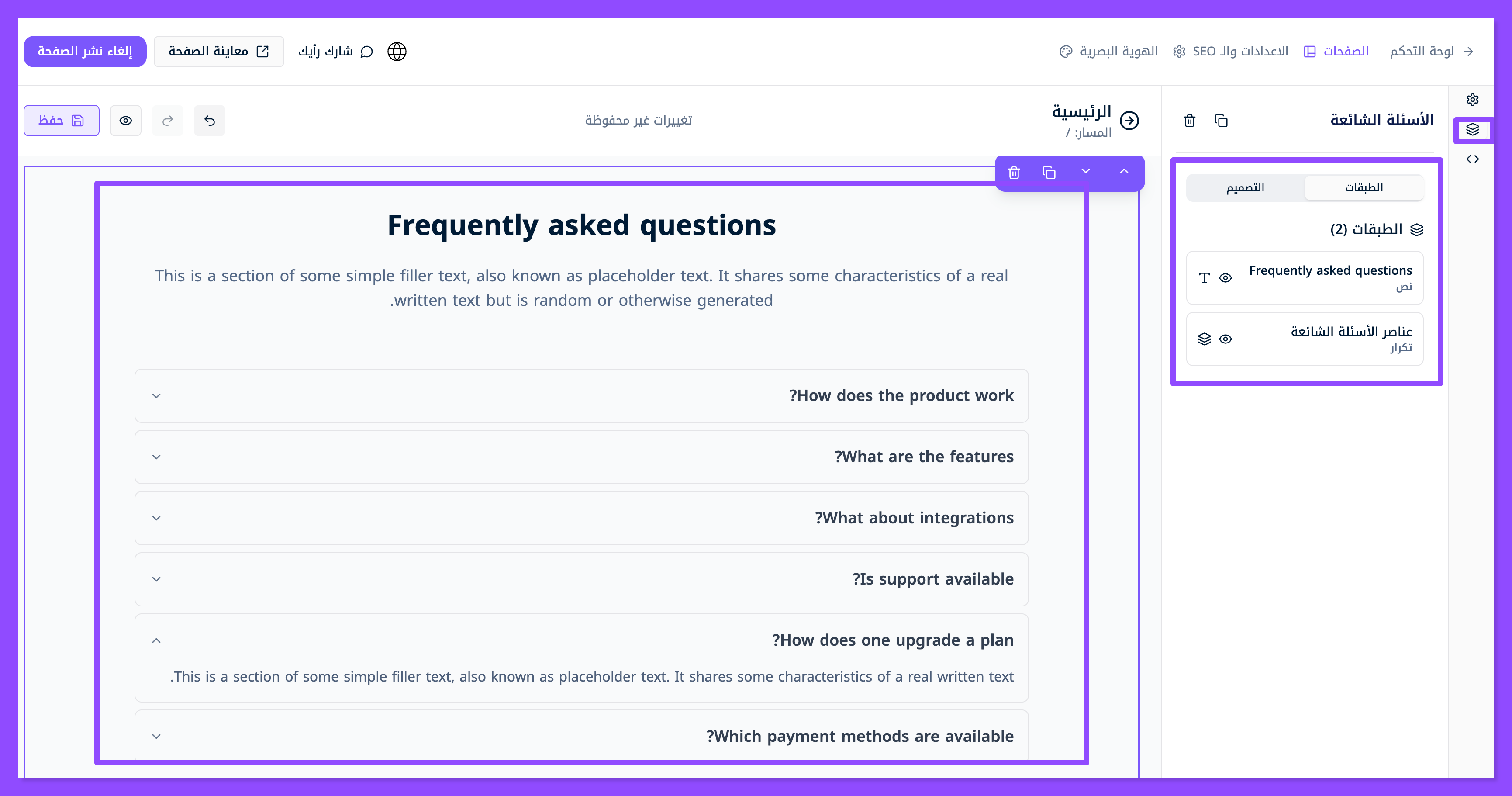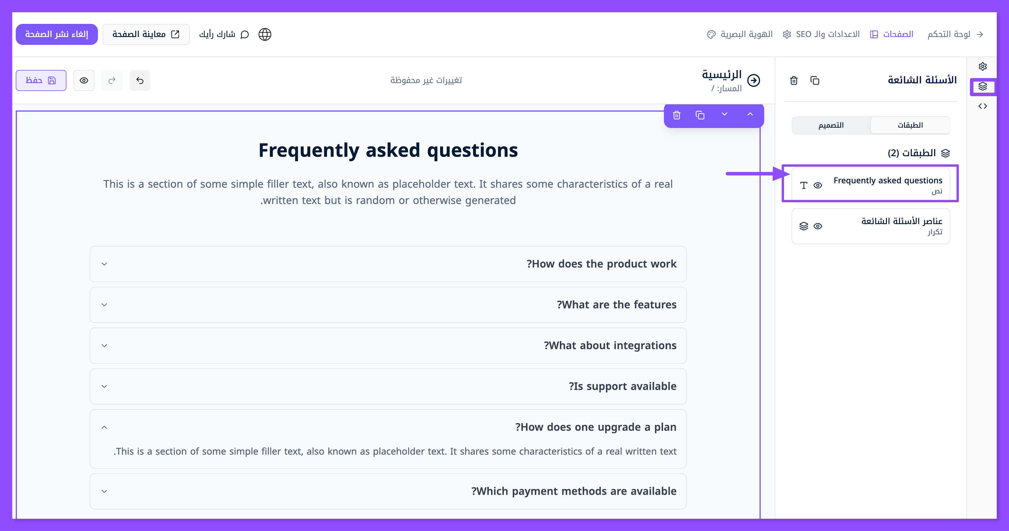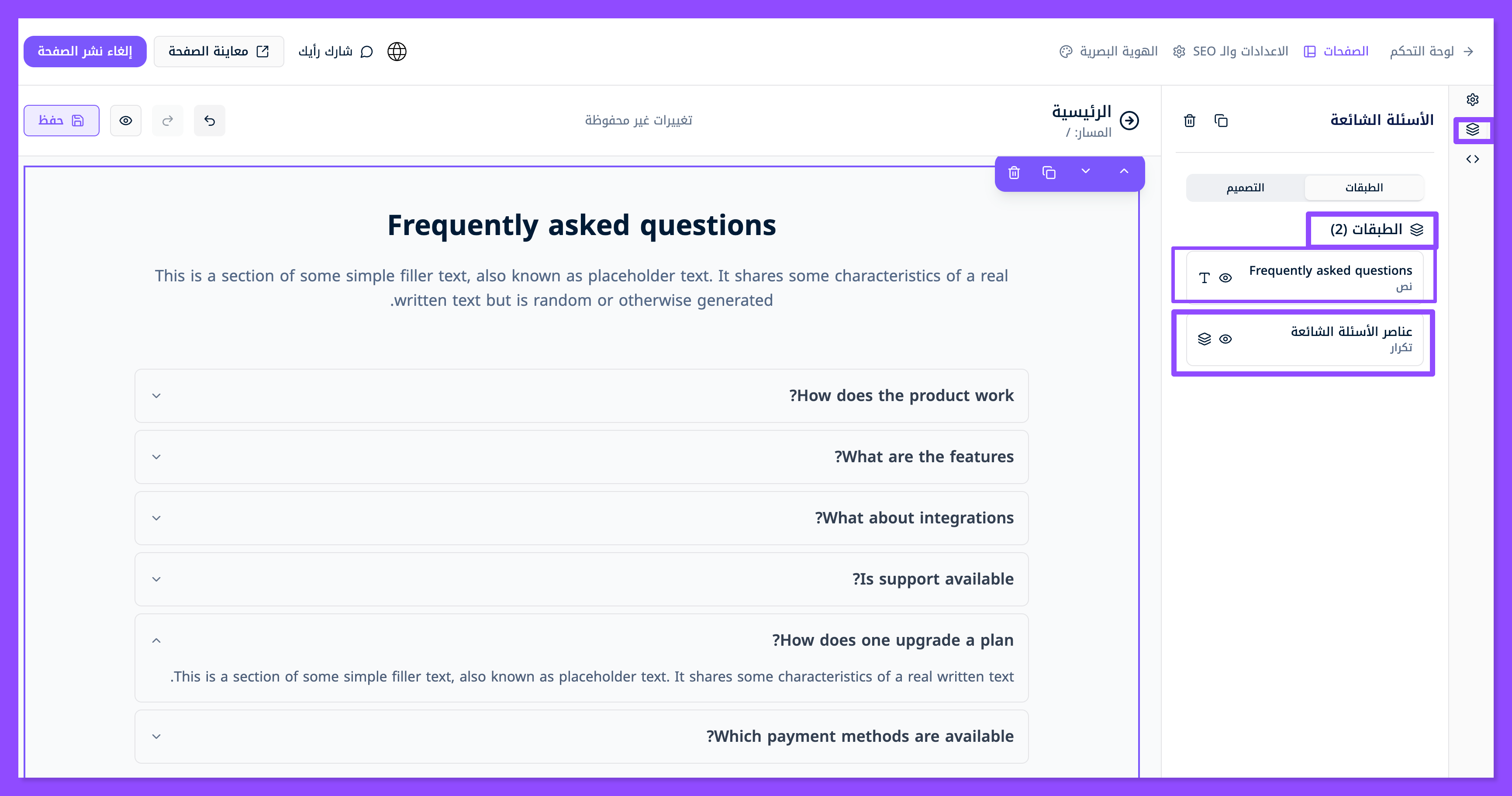 تظهر لك طبقتين، الطبقة الأولى معنية بتعديل العنوان الرئيسي والوصف الفرعي للقسم، أما الطبقة الثانية فهي معنية بتخصيص كل سؤال وجواب تريد وضعه في قسم الأسئلة الشائعة.
