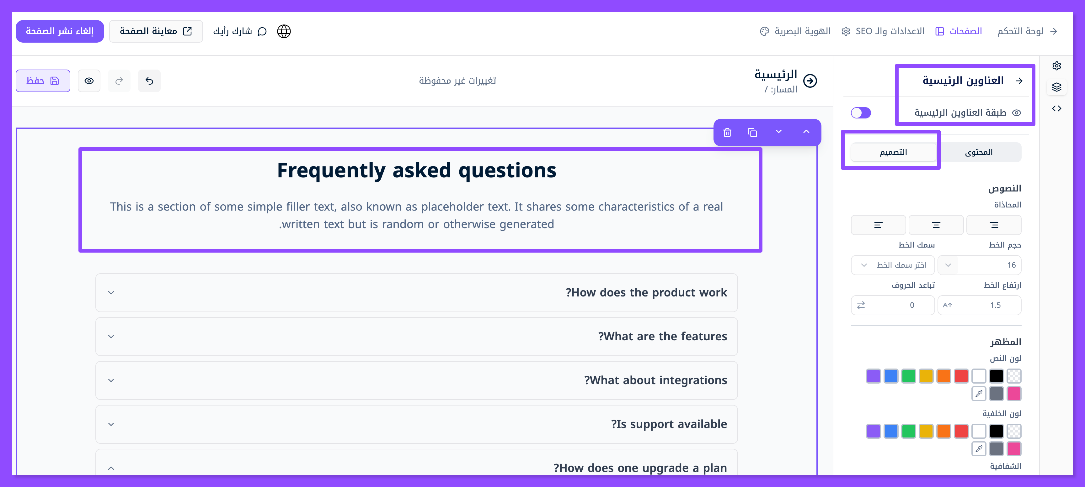 لتغيير تصميم العناوين الرئيسية اضغط على نافذة التصميم حيث تستطيع تغيير لون النص ومحاذاته وحجمه وثقله حسب هويتك البصرية.