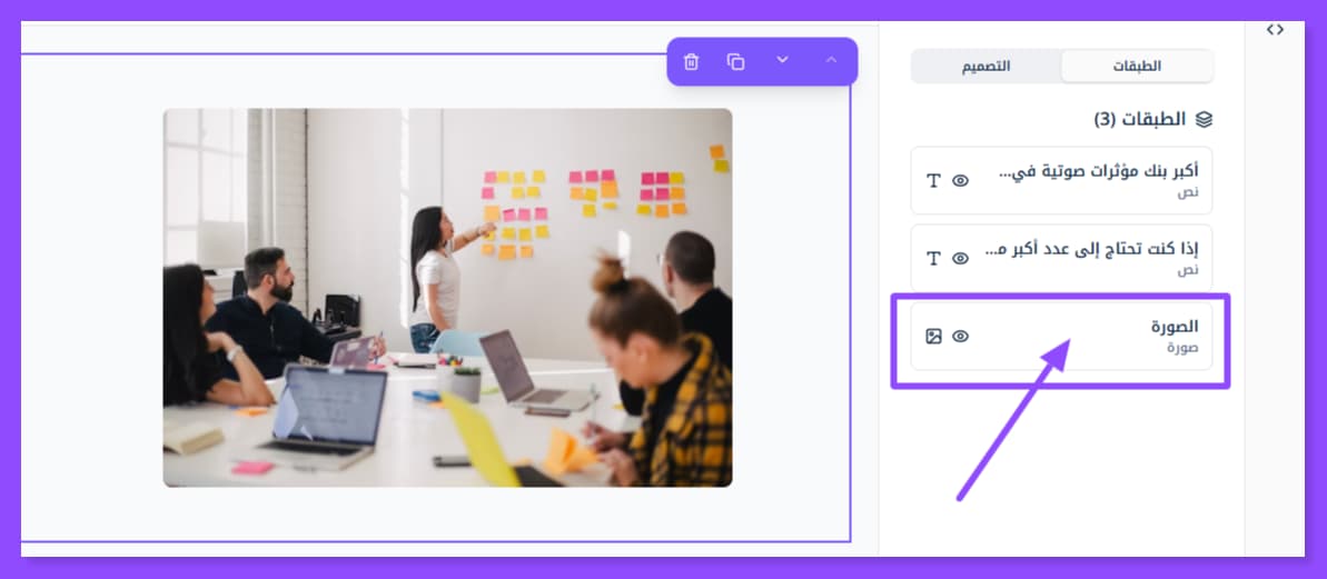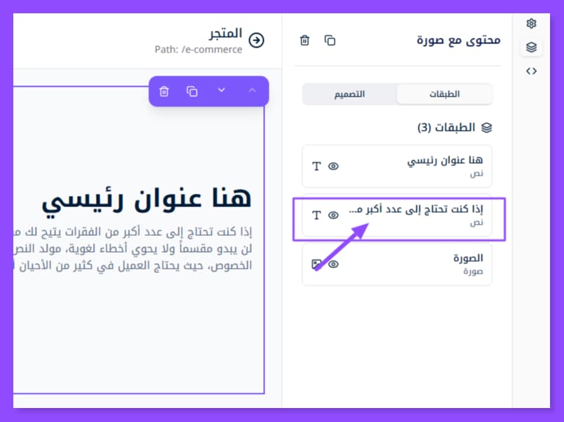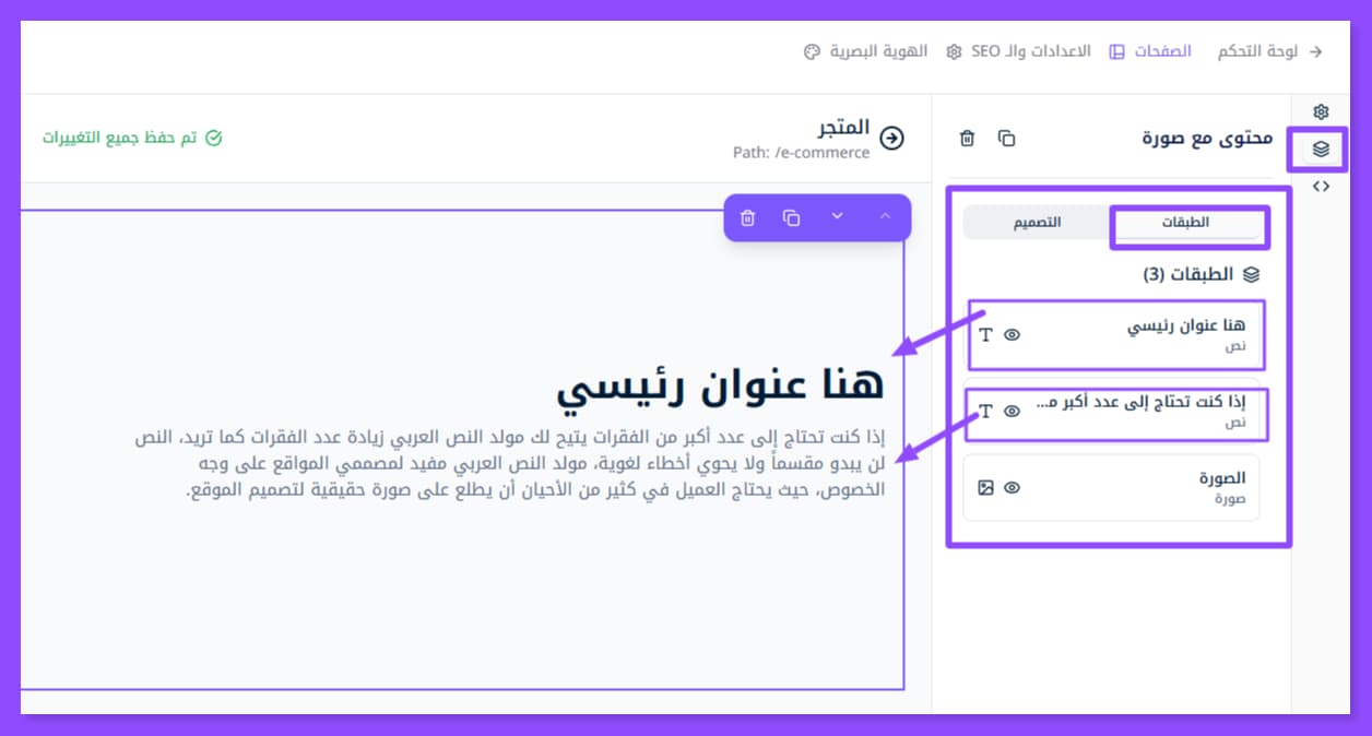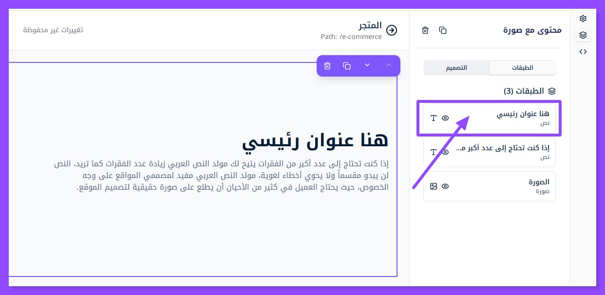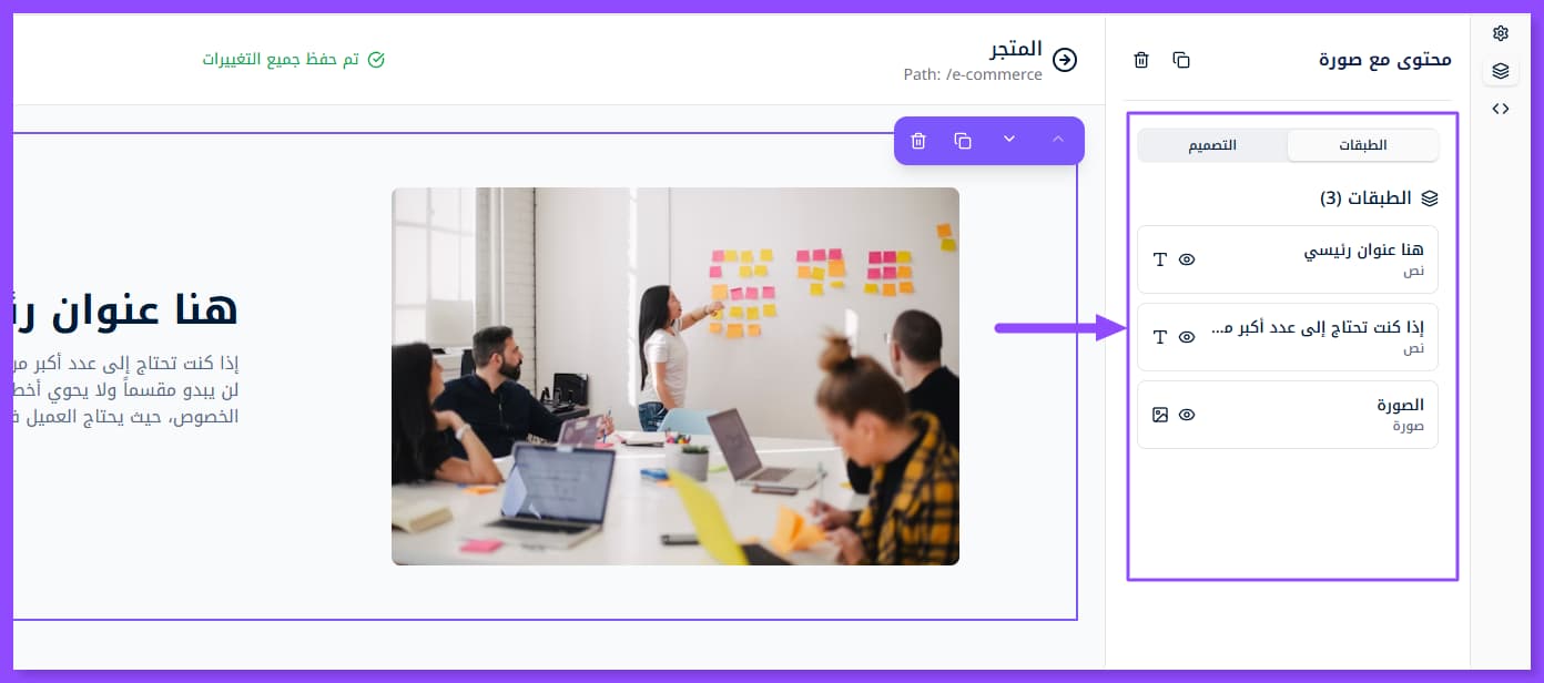 بمجرد إضافة القسم الذي تريد تعديله تظهر لك هذه النافذة على اليمين. وقد لا تظهر إلا عبر الضغط على أيقونة الطبقات الظاهرة في أقصى اليسار.