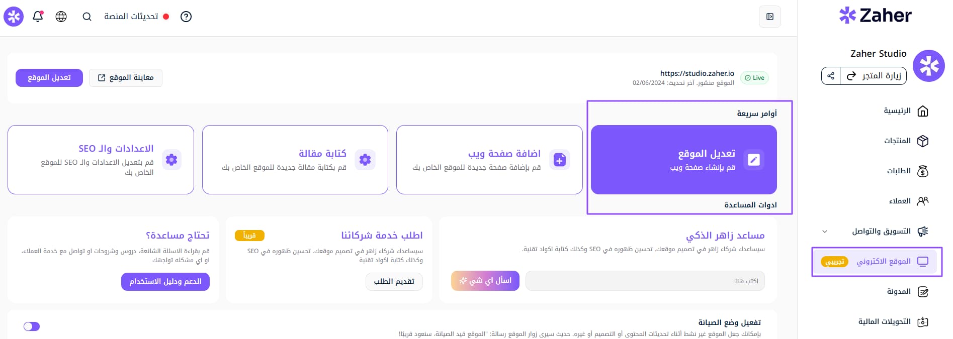 1- سجل الدخول إلى لوحة التحكم الخاصة بك ومنها إلى قسم الموقع الإلكتروني في متجرك.