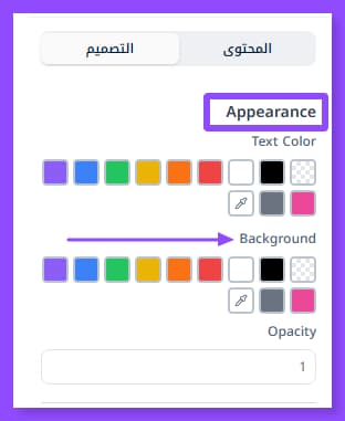 من خانة (Appearcance) في قسم التصميم، تحديدًا من جهة (Background) تستطيع اختيار لون الخلفية الملائم لهويتك البصرية."قبلها اختار طبقة النص التي تريد تغيير لون خلفيتها من قسم الطبقات٫ إذ تستطيع تعديل لون خلفية كل طبقة نص على حدة"