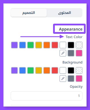 من خانة (Appearcance) في قسم التصميم، تحديدًا من جهة (Text Color) تستطيع اختيار لون النص الملائم لهويتك البصرية واختياره.قبلها اختار طبقة النص التي تريد تغيير لون نصها من قسم الطبقات٫ إذ تستطيع تعديل لون كل طبقة نص على حدة.