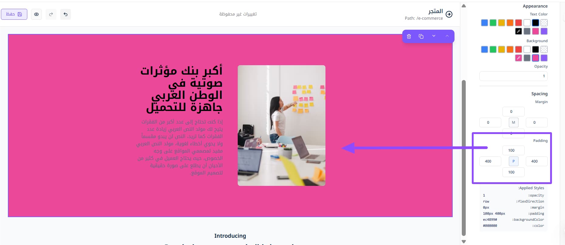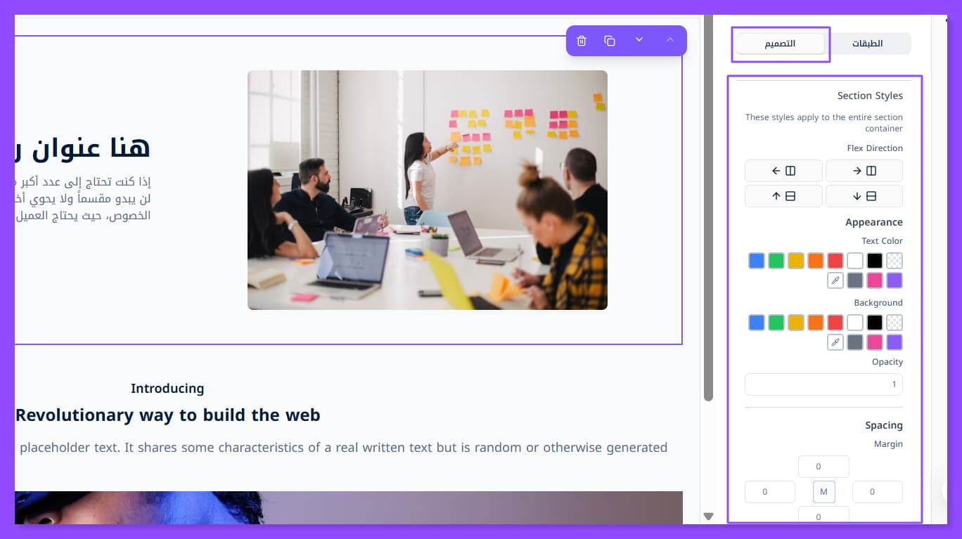 بمجرد إضافة القسم الذي تريد تعديله تظهر لك هذه النافذة على اليمين. وقد لا تظهر إلا عبر الضغط على أيقونة الطبقات الظاهرة في أقصى اليسار.