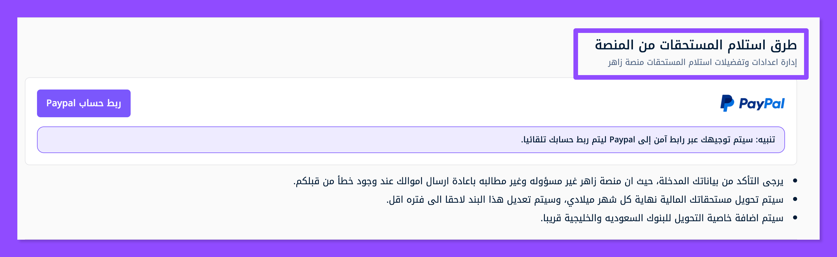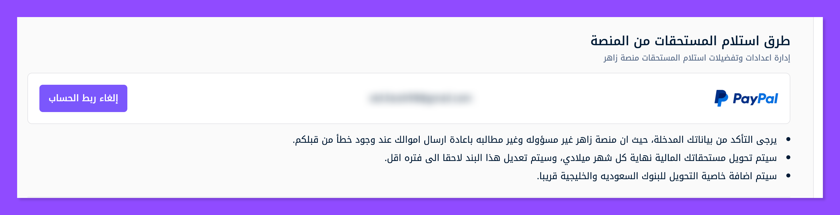 وهكذا تكون قد أضفت حساب بايبال الخاص بك بنجاح في زاهر، وسوف يتم تحتويل أرباحك من زاهر إليه تلقائيًا في الموعد المحدد.