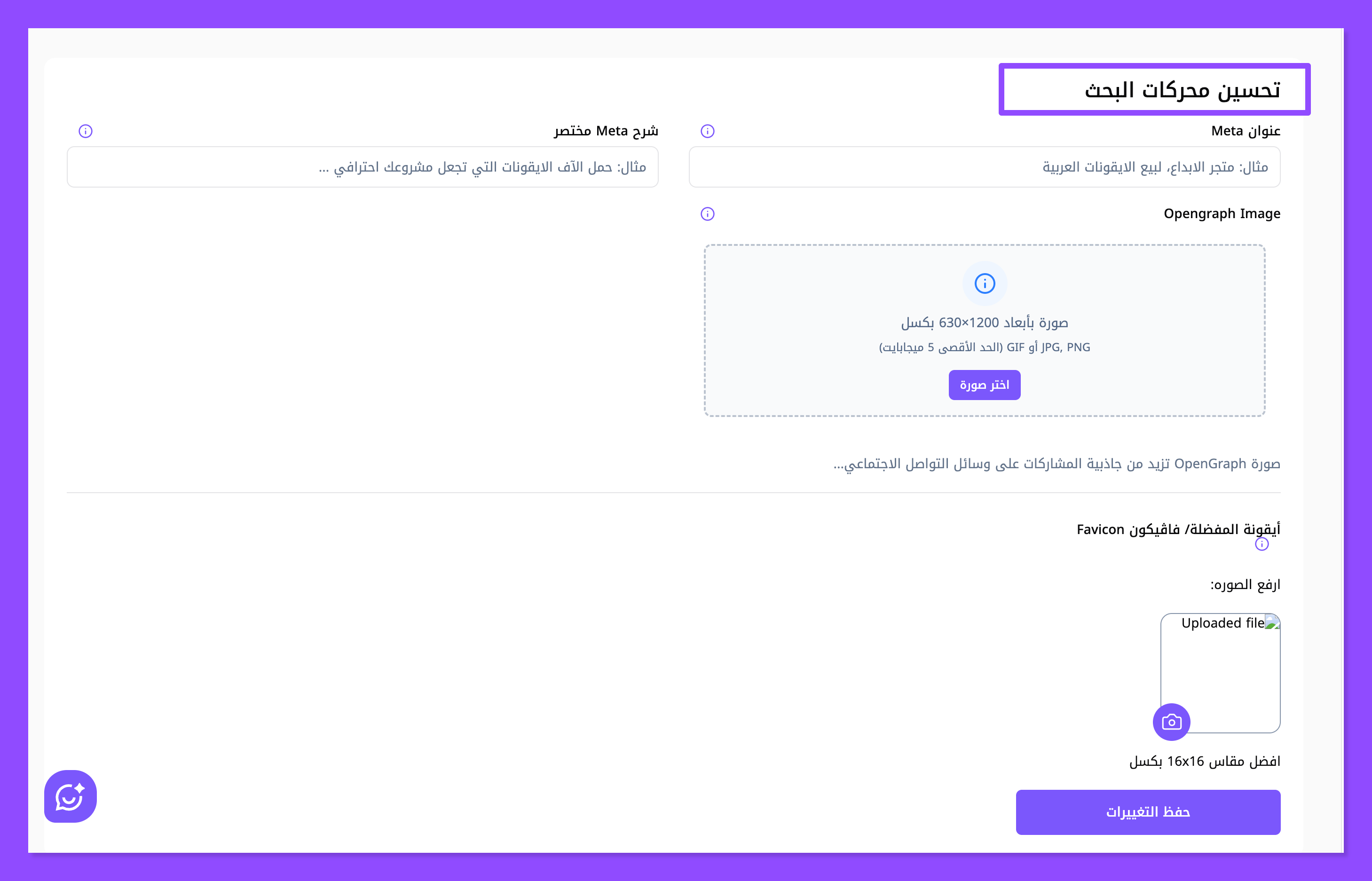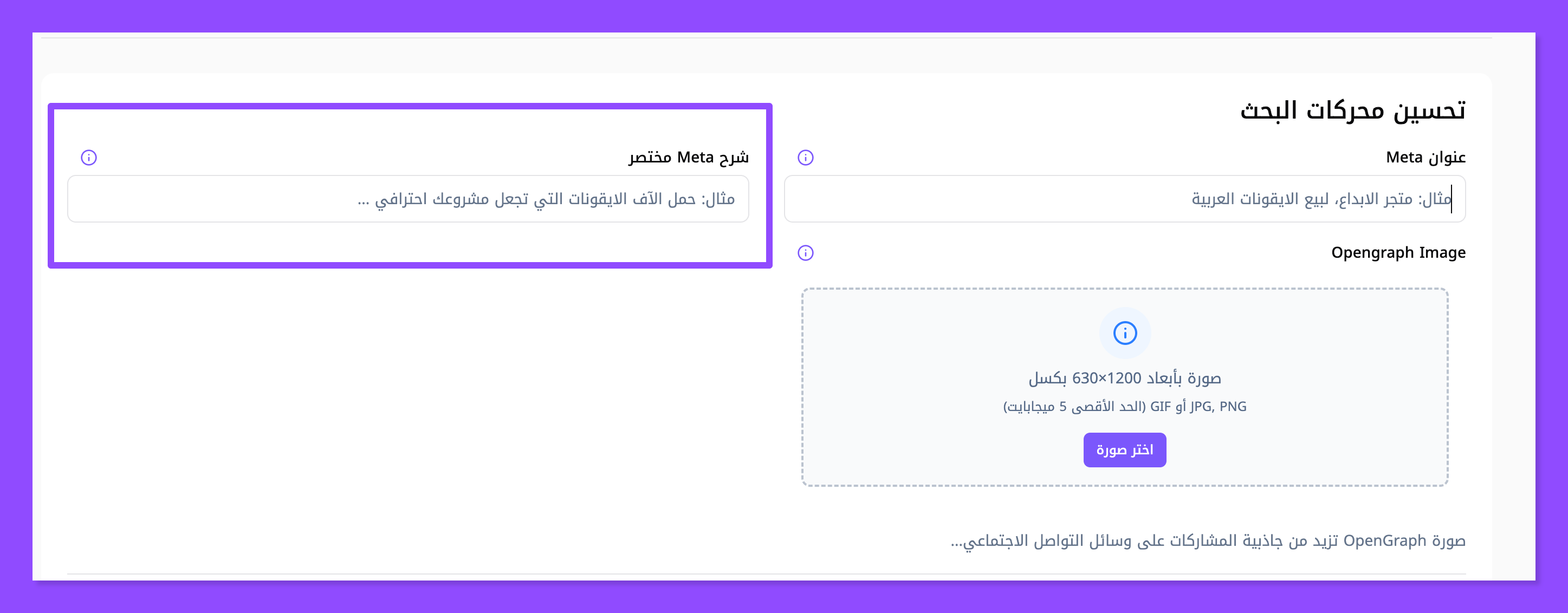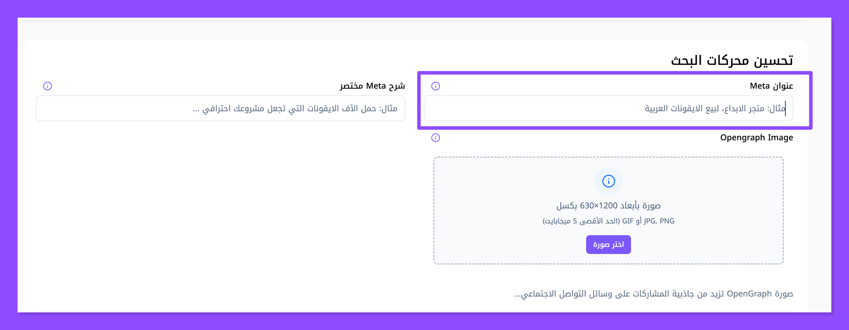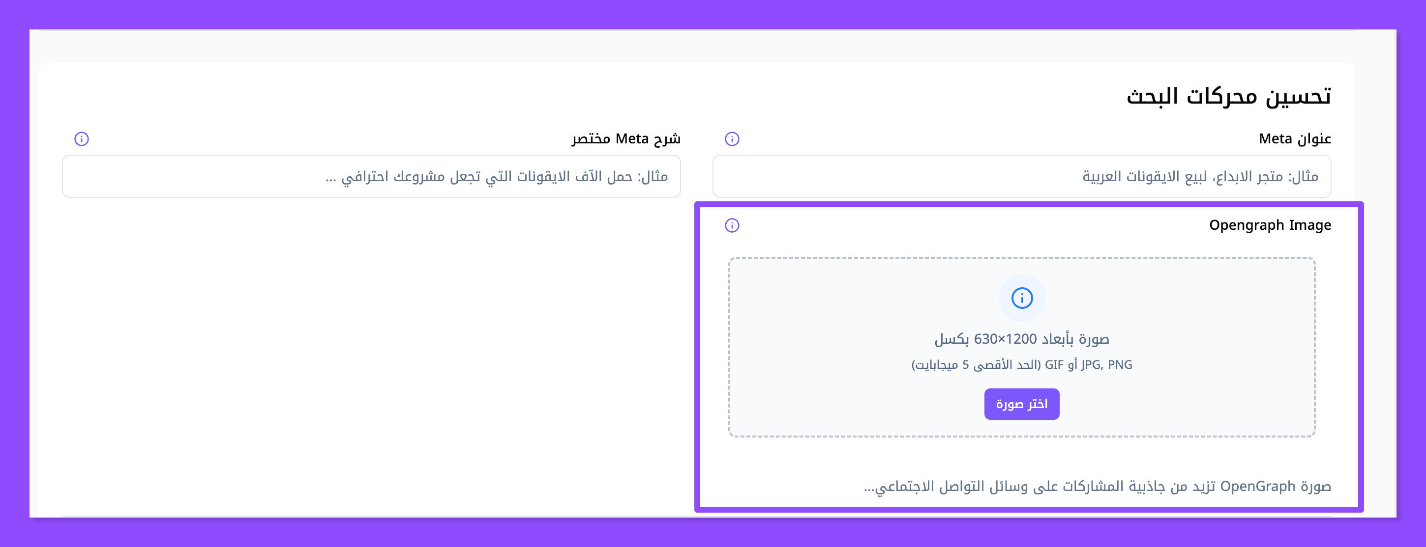 في قسم (Opengraph image)، تستطيع تحميل الصورة التي سوف تظهر عند مشاركة رابط متجرك في رسالة أو في منشور، بدلاً من أن يظهر الرابط وحده، ستظهر صورة مميزة تحمل شعار متجرك أو منتجاتك مع العنوان (مثل إعلان صغير يعكس هوية علامتك التجارية).
