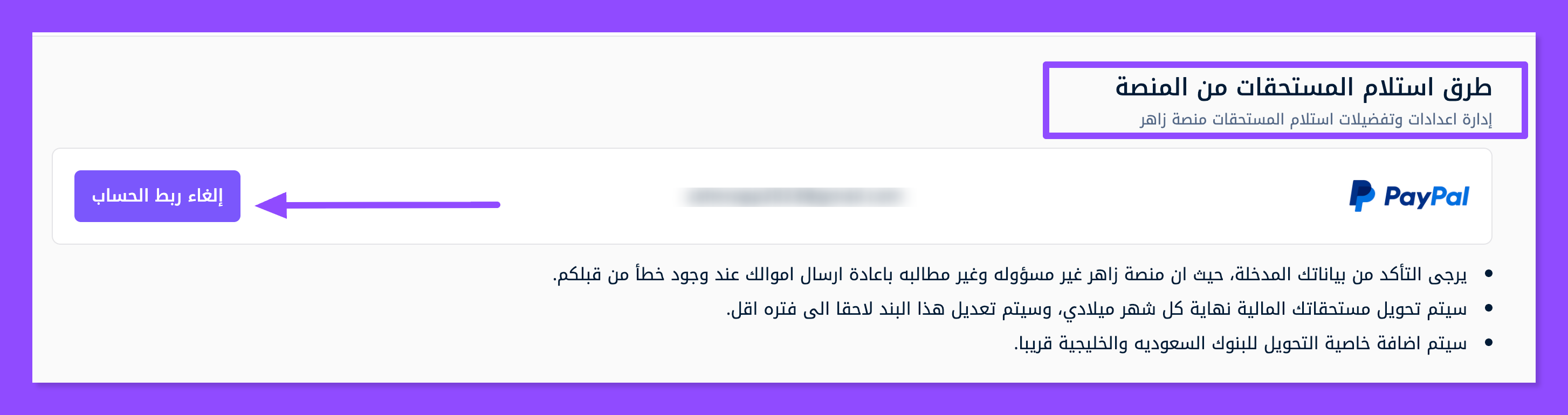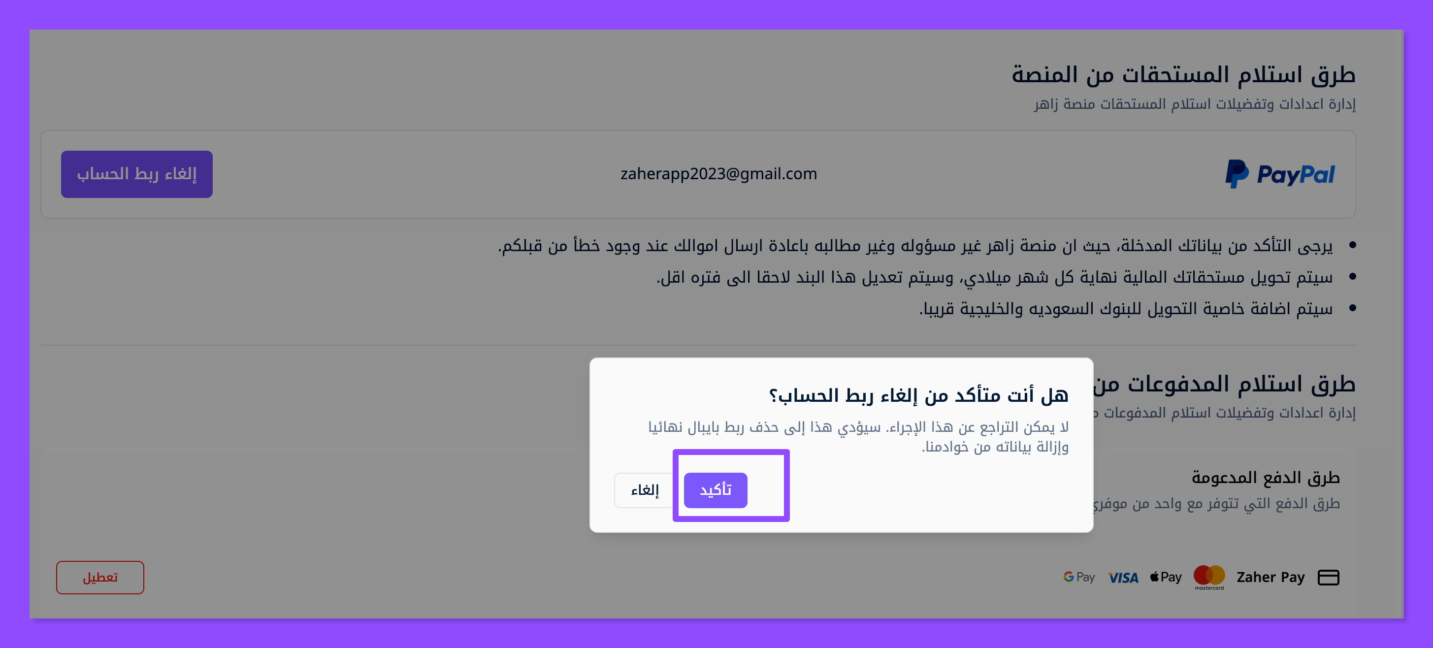 تظهر لك هذه النافذة لتؤكد من خلالها رغبتك في إلغاء ربط حسابك بايبال بشكل لا رجعة فيه، إذا كنت متأكدًا من ذلك، اضغط على زر تأكيد.
